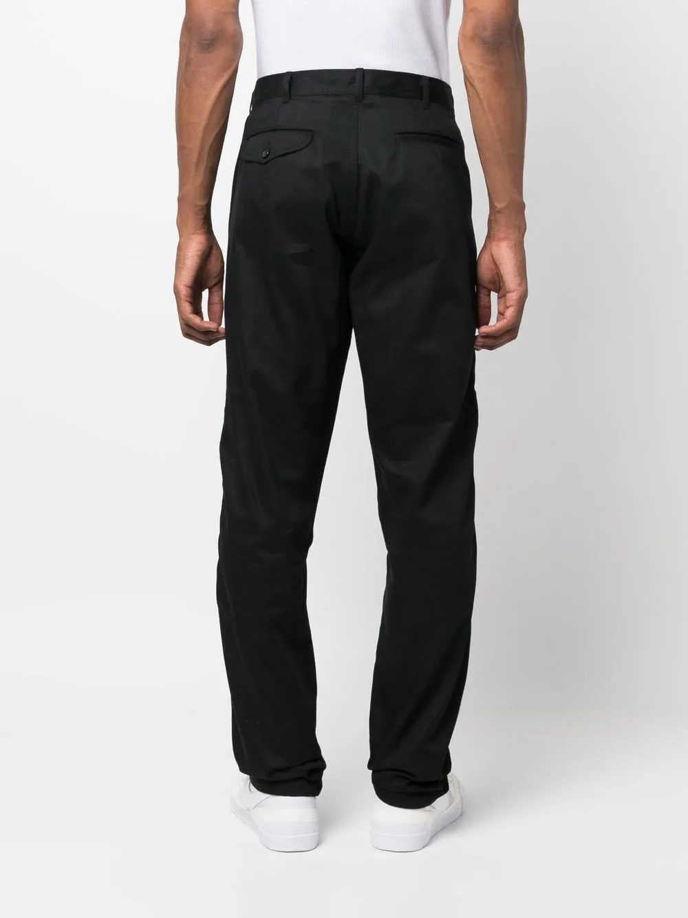 Черный, хлопок, передние карманы на молнии, петли для ремня, ширинка на молнии и узкий крой.
