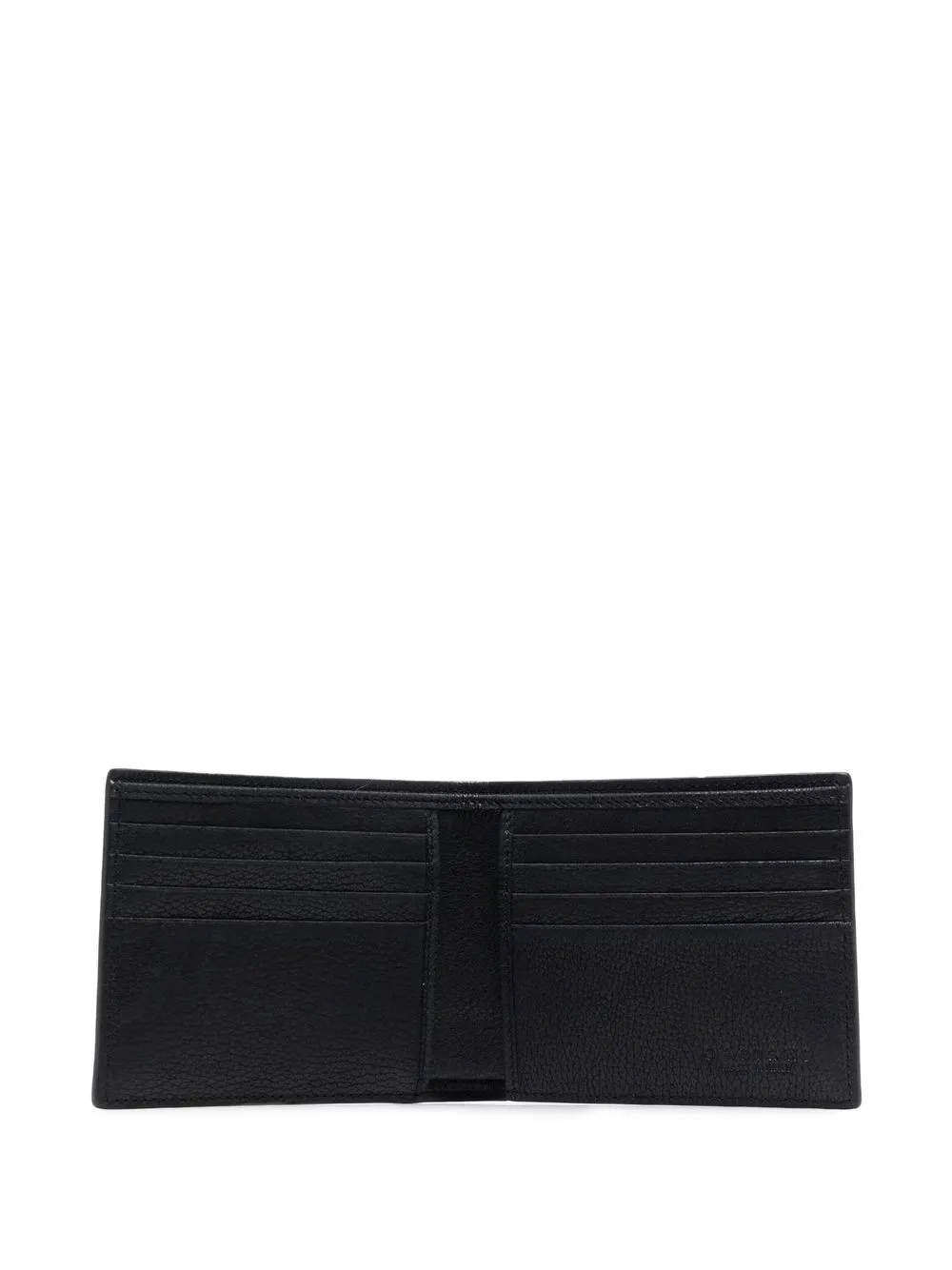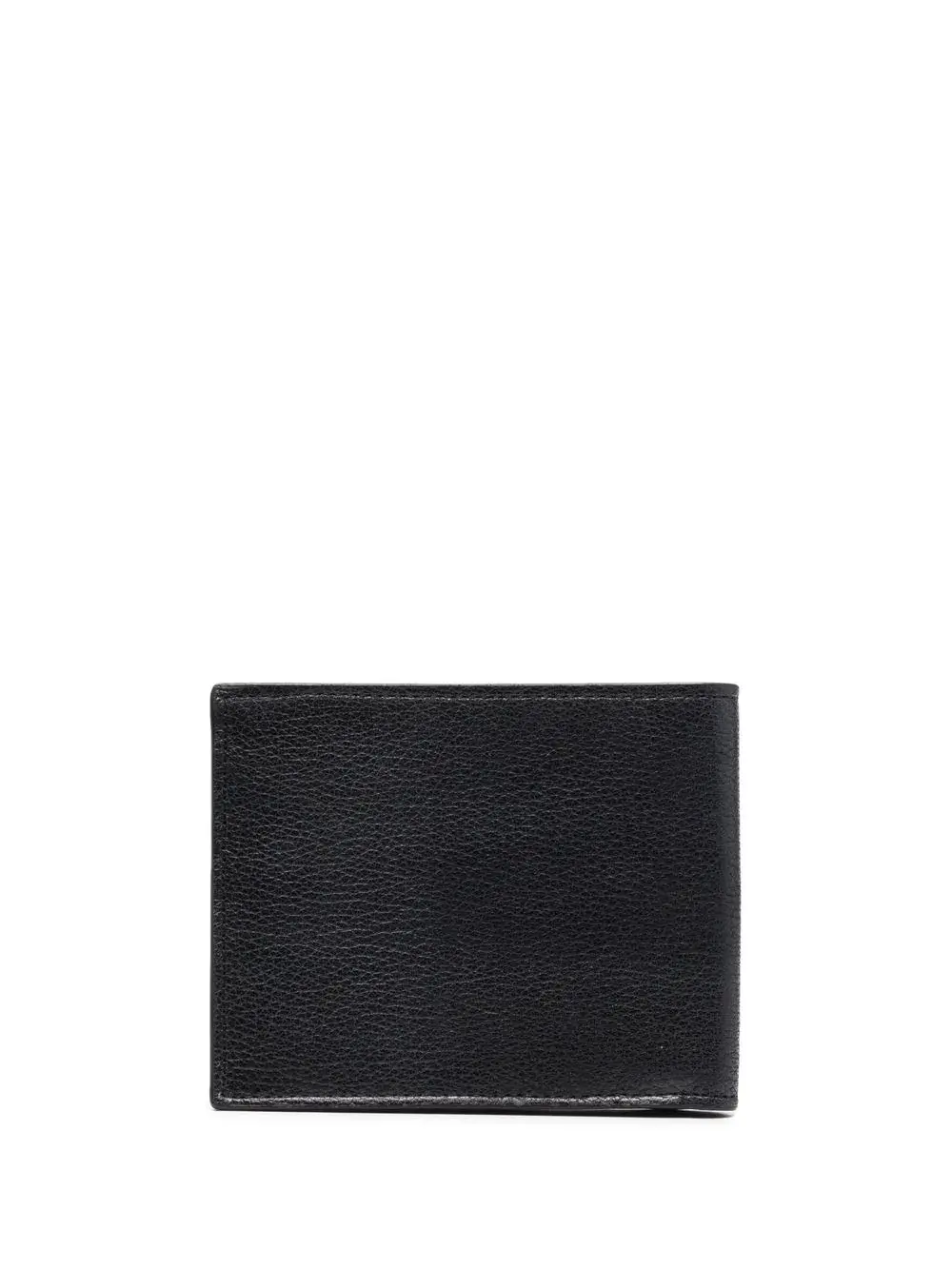 Коричневый, телячья кожа, серебристый металлический логотип, два сложения и внутренние отделения для карт.