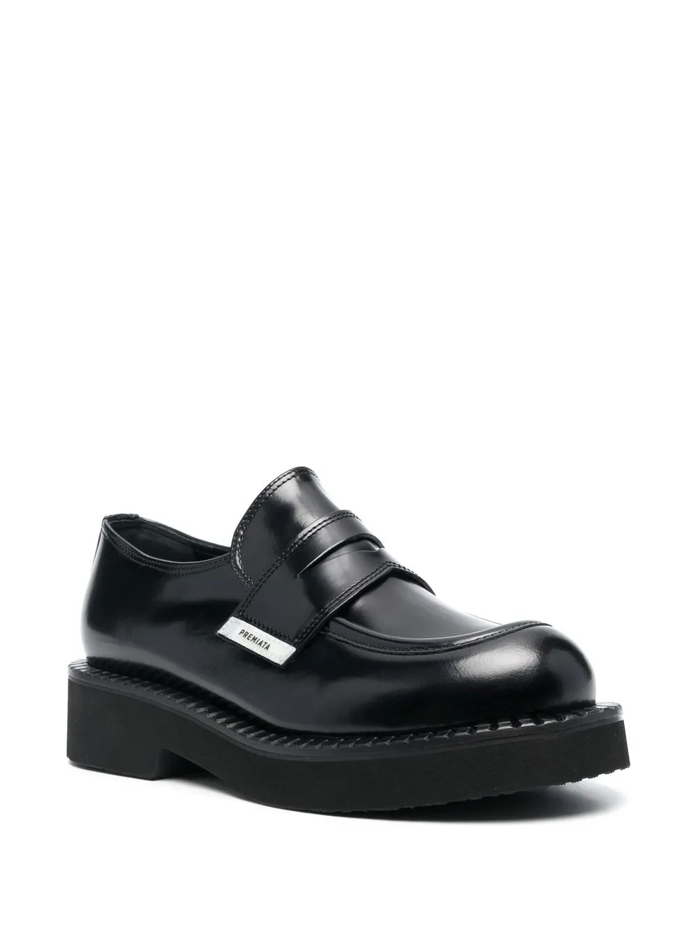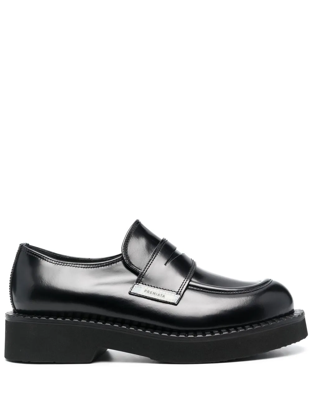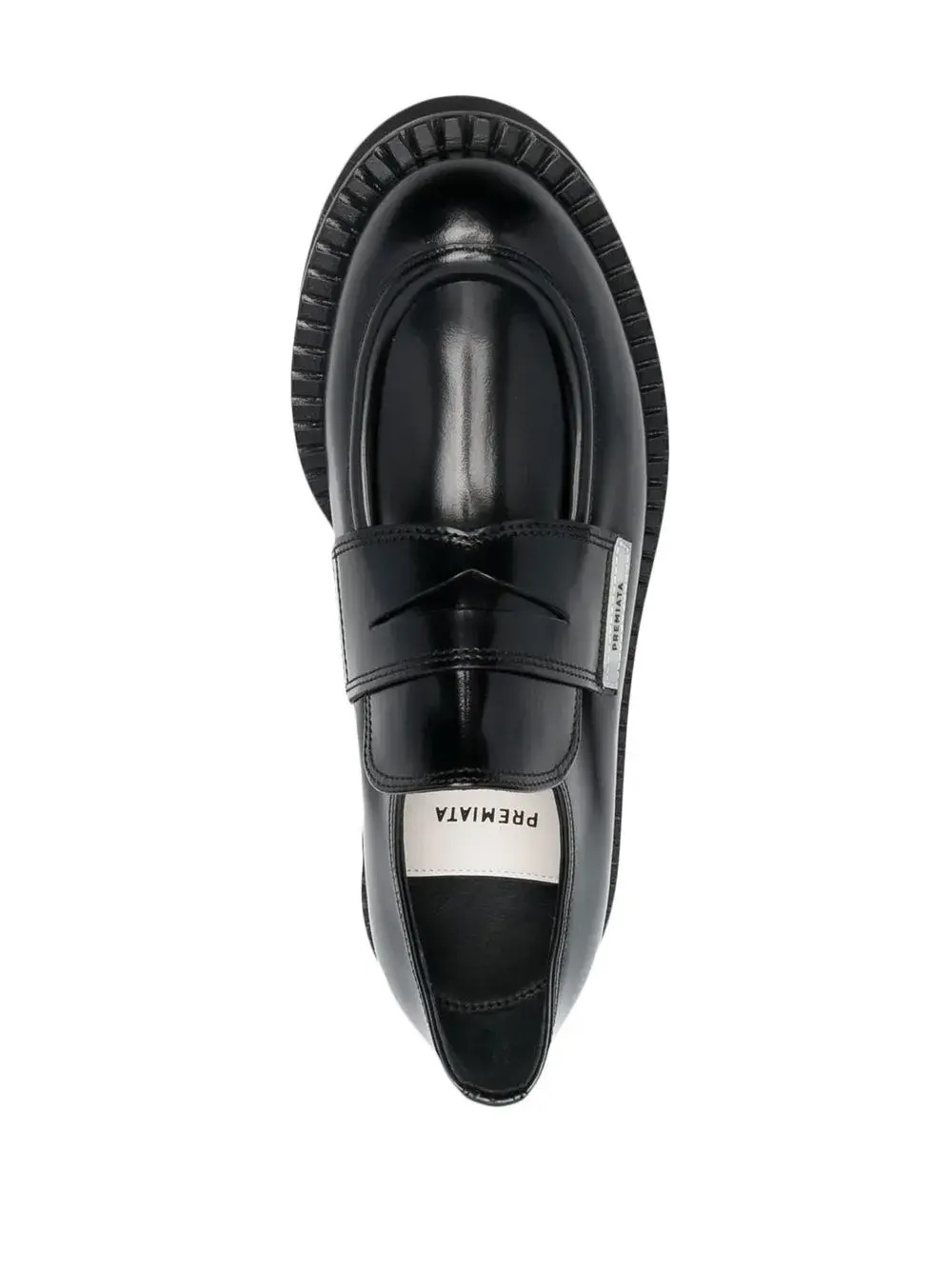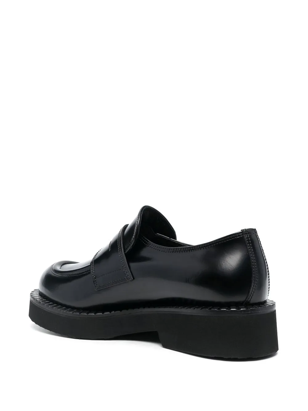 Черный, телячья кожа, маленькая подвеска с логотипом, кожаная стелька с логотипом, закругленный носок, модель без застежки, массивная резиновая подошва c протектором и низкий блочный каблук.