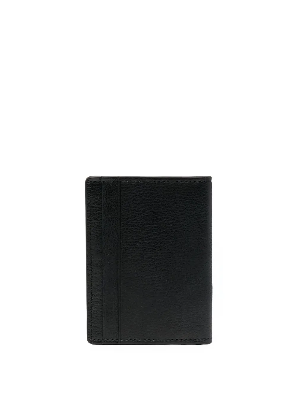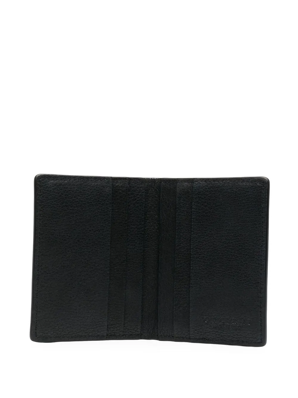 Черный, телячья кожа, зернистая текстура, серебристый металлический логотип, тисненый логотип внутри и отделения для карт.
