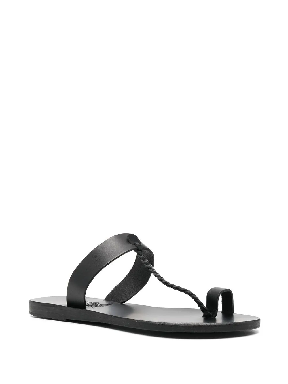 Черный, телячья кожа, плетеная отделка, кожаная стелька с логотипом, открытый носок, модель без застежки и плоская резиновая подошва.
