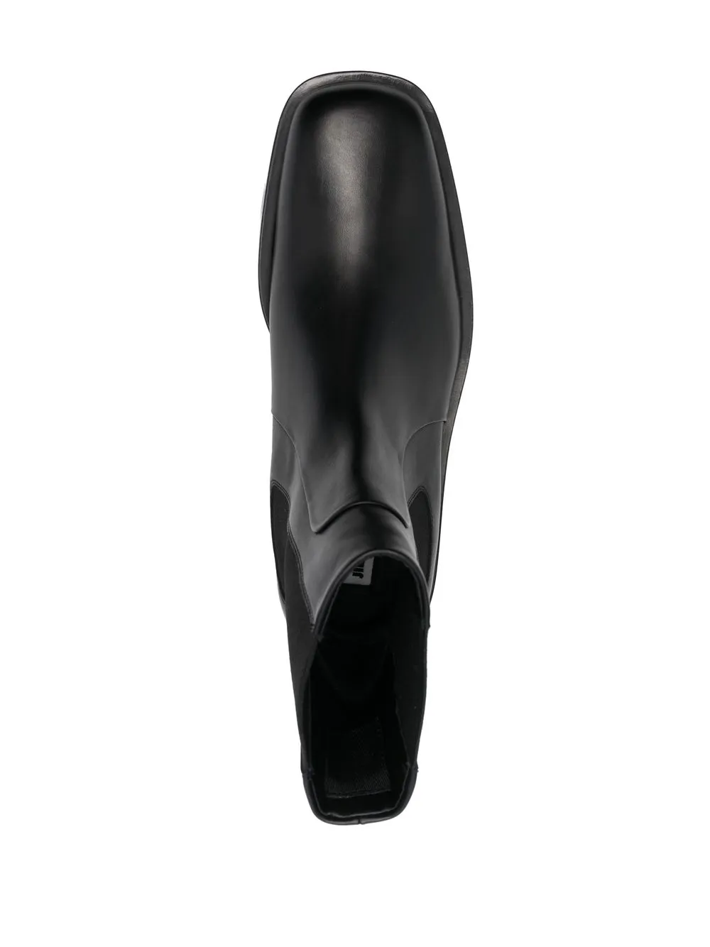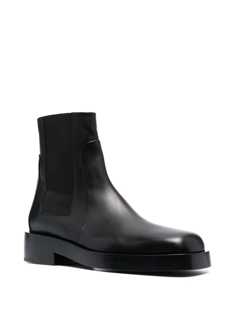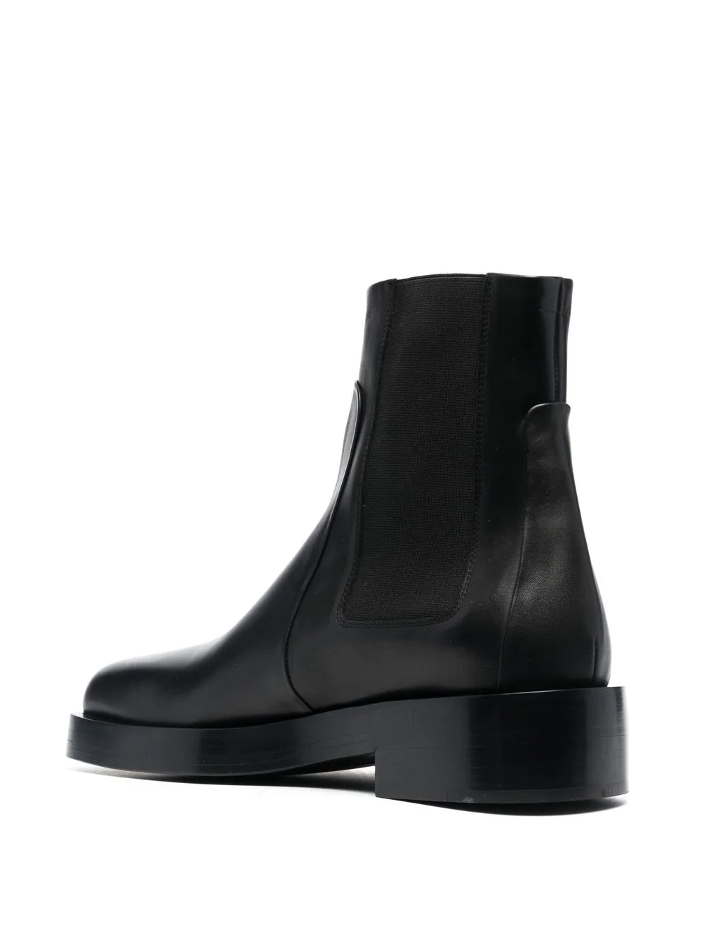 Черный, телячья кожа, эластичные боковые вставки, высота по щиколотку и низкий блочный каблук.