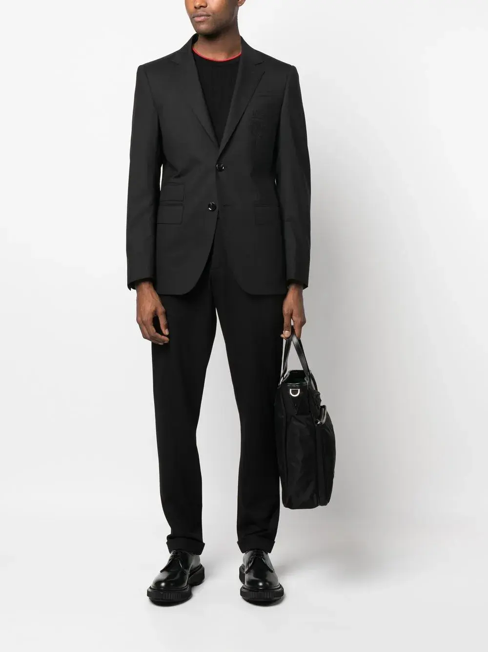 Черный, узор с эмблемой, отложный воротник, застежка на пуговицах спереди, длинные рукава, прорезной карман на груди, передние карманы с клапаном, шлица по центру сзади и атласная подкладка.