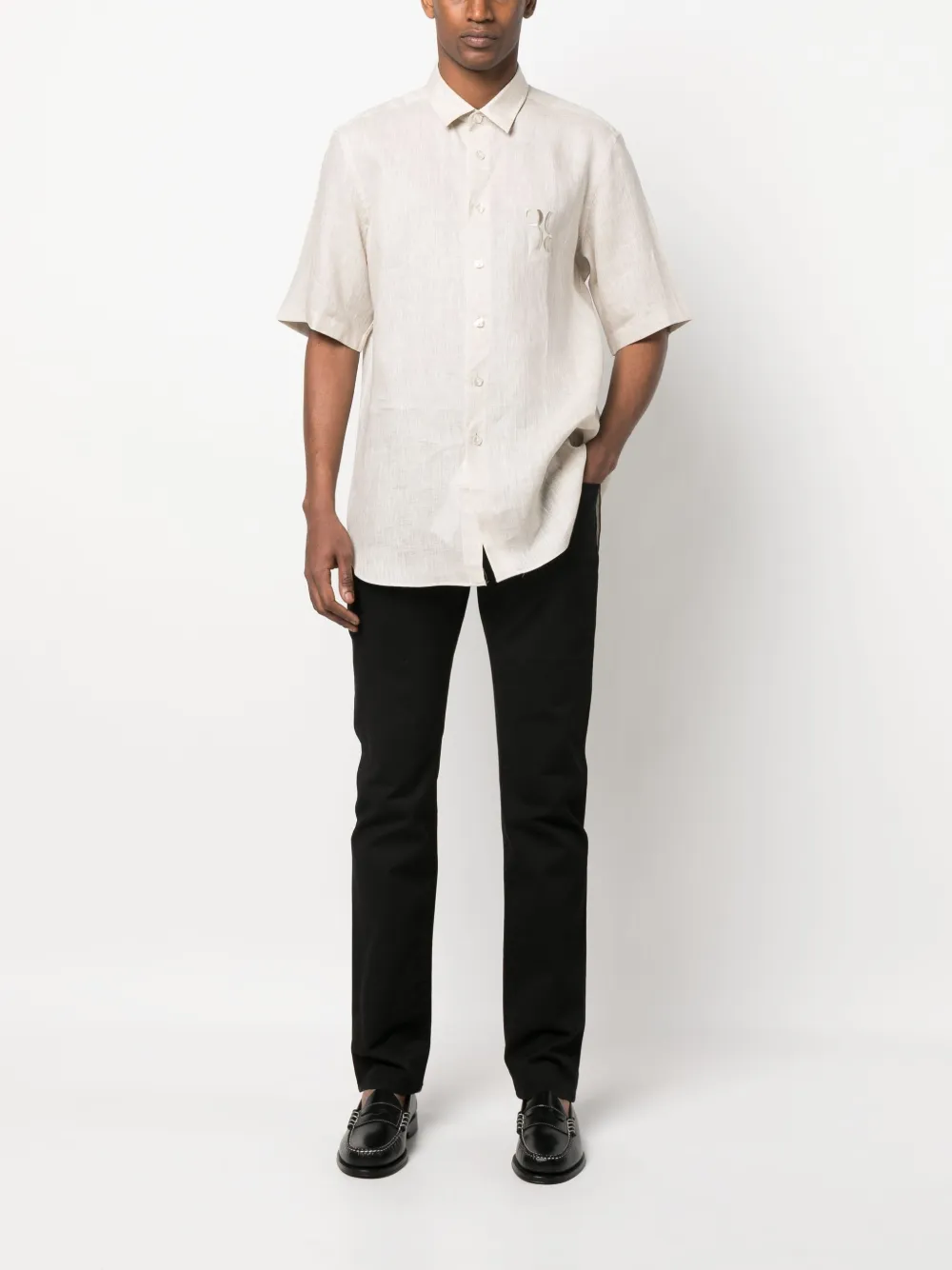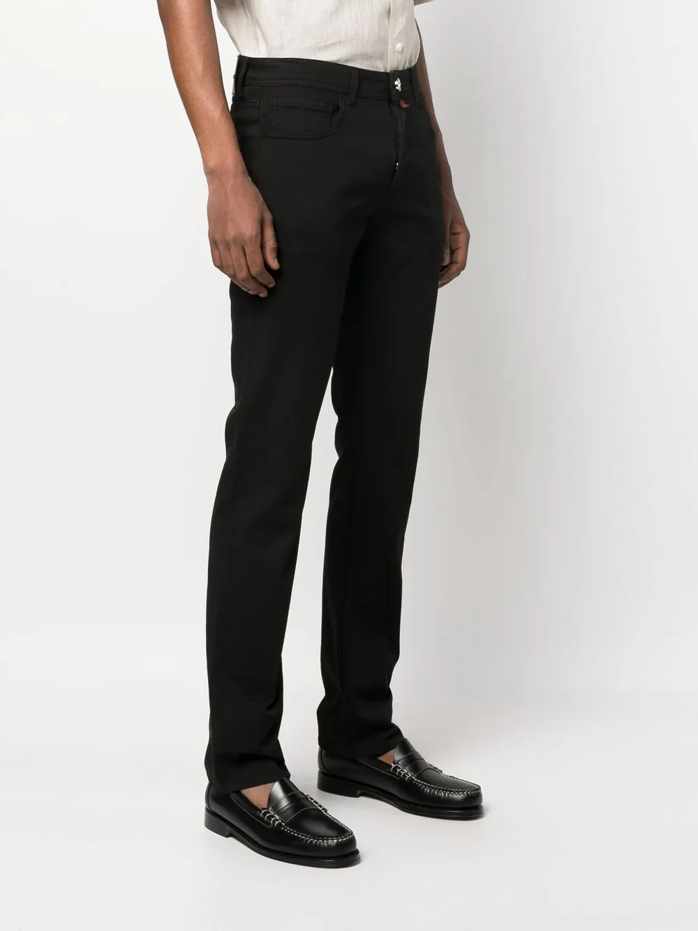 Черный, эластичный хлопок, вышитый логотип сзади, средняя посадка, петли для ремня, ширинка на пуговицах, пять карманов, нашивка с логотипом сзади и прямой крой.
