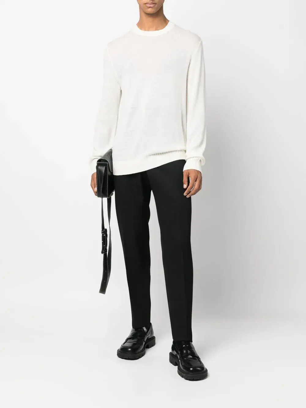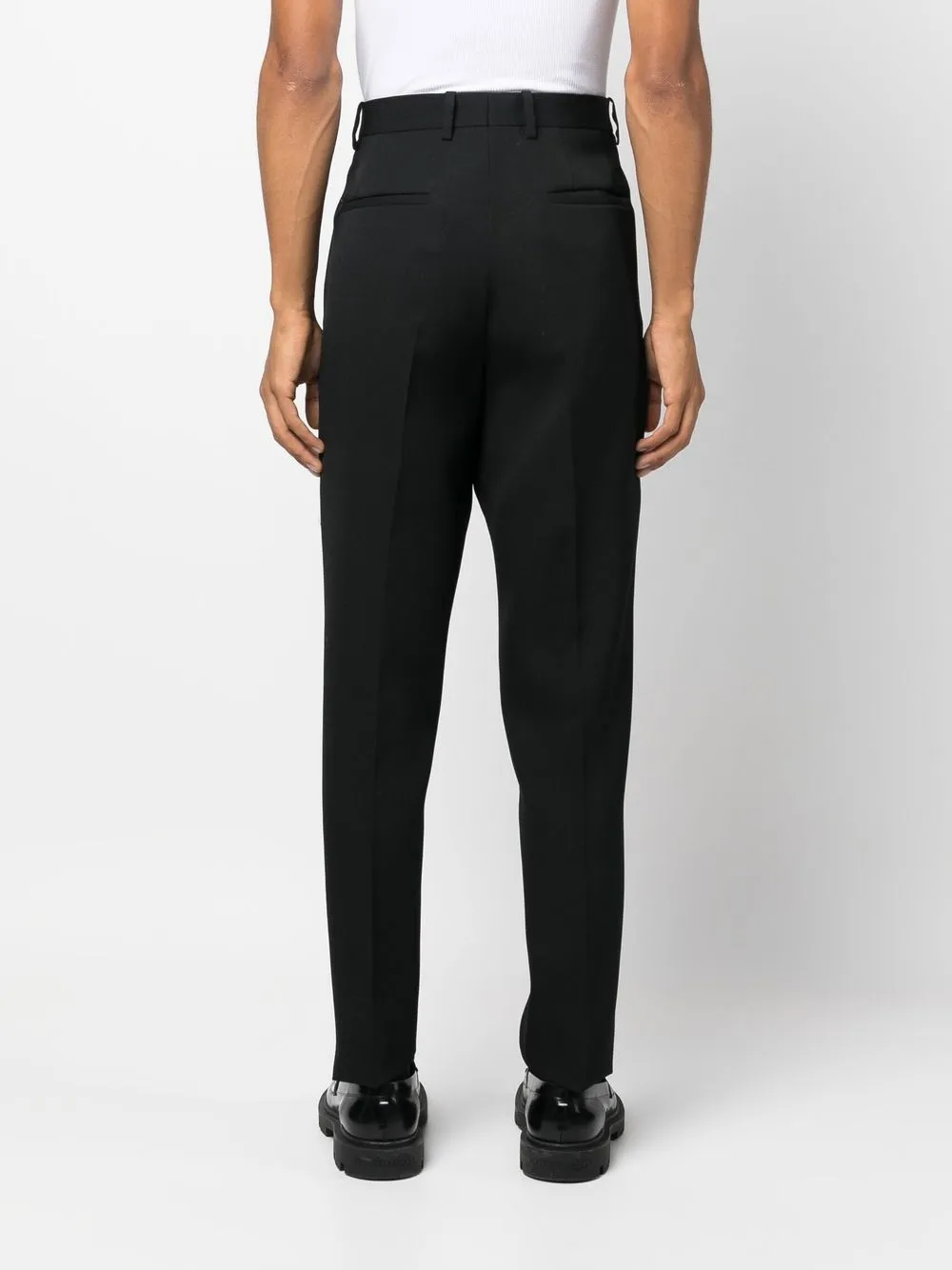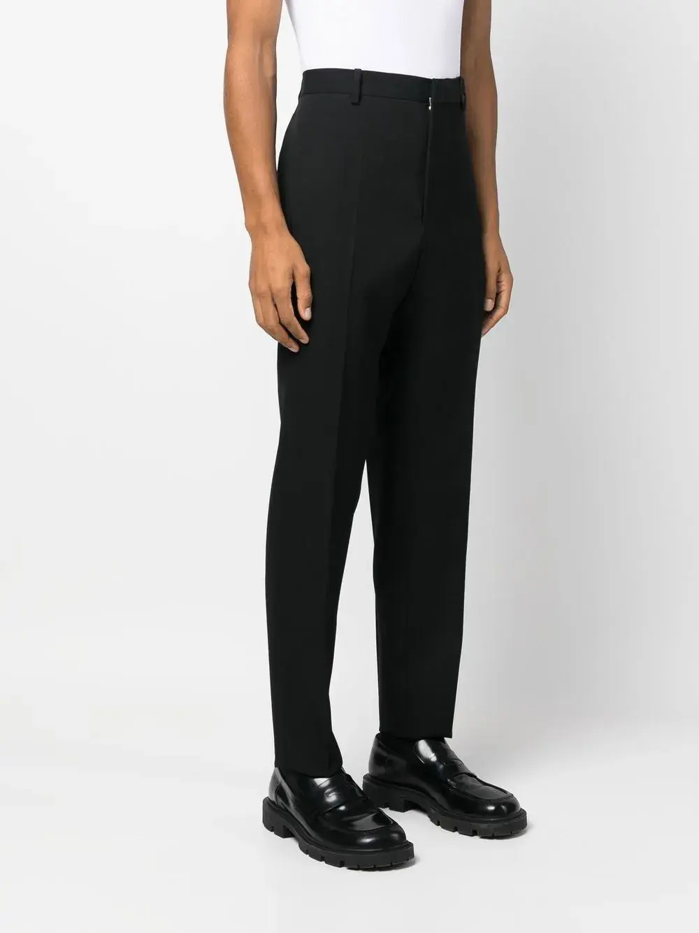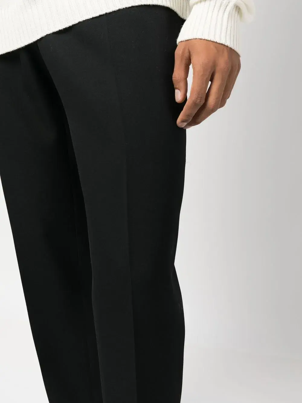 Черный, шерсть, хлопок, потайная застежка спереди, петли для ремня, два кармана с листочкой сзади, завышенная талия и зауженный крой.