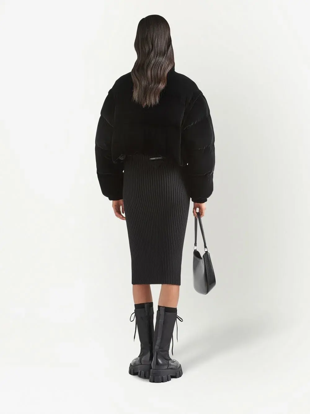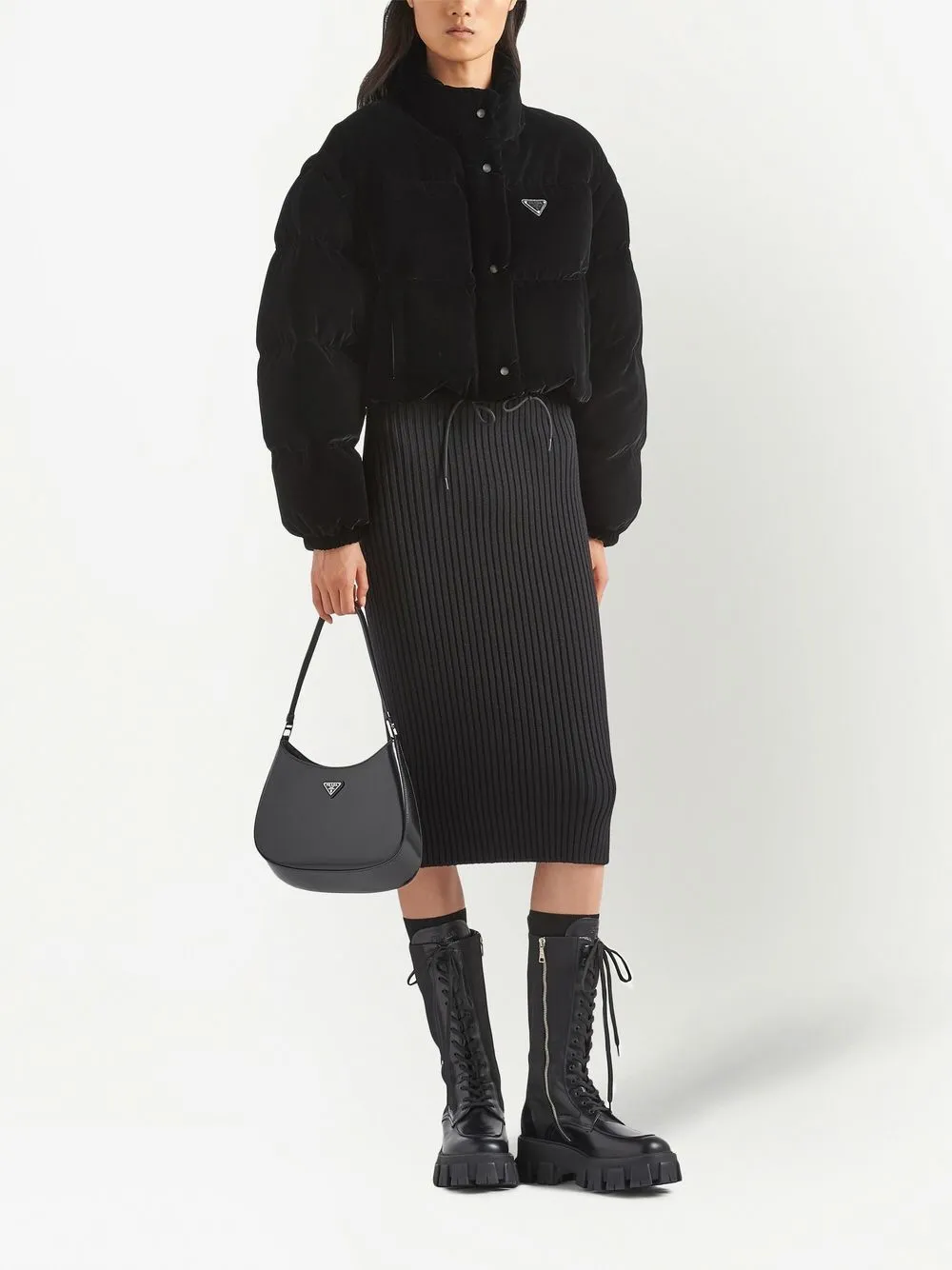 Подробнее о товаре: Черный, переработанный нейлон, бархат, наполнитель из смеси пуха и пера, дутый материал, съемные рукава, серебристая фурнитура, треугольный эмалированный логотип, высокий воротник, застежка на кнопки и молнию спереди, длинные рукава, эластичные манжеты, подол с кулиской, укороченная длина и два передних кармана с листочкой. Ответственный выбор: Этот товар как минимум на 50% состоит из переработанных или повторно использованных материалов.