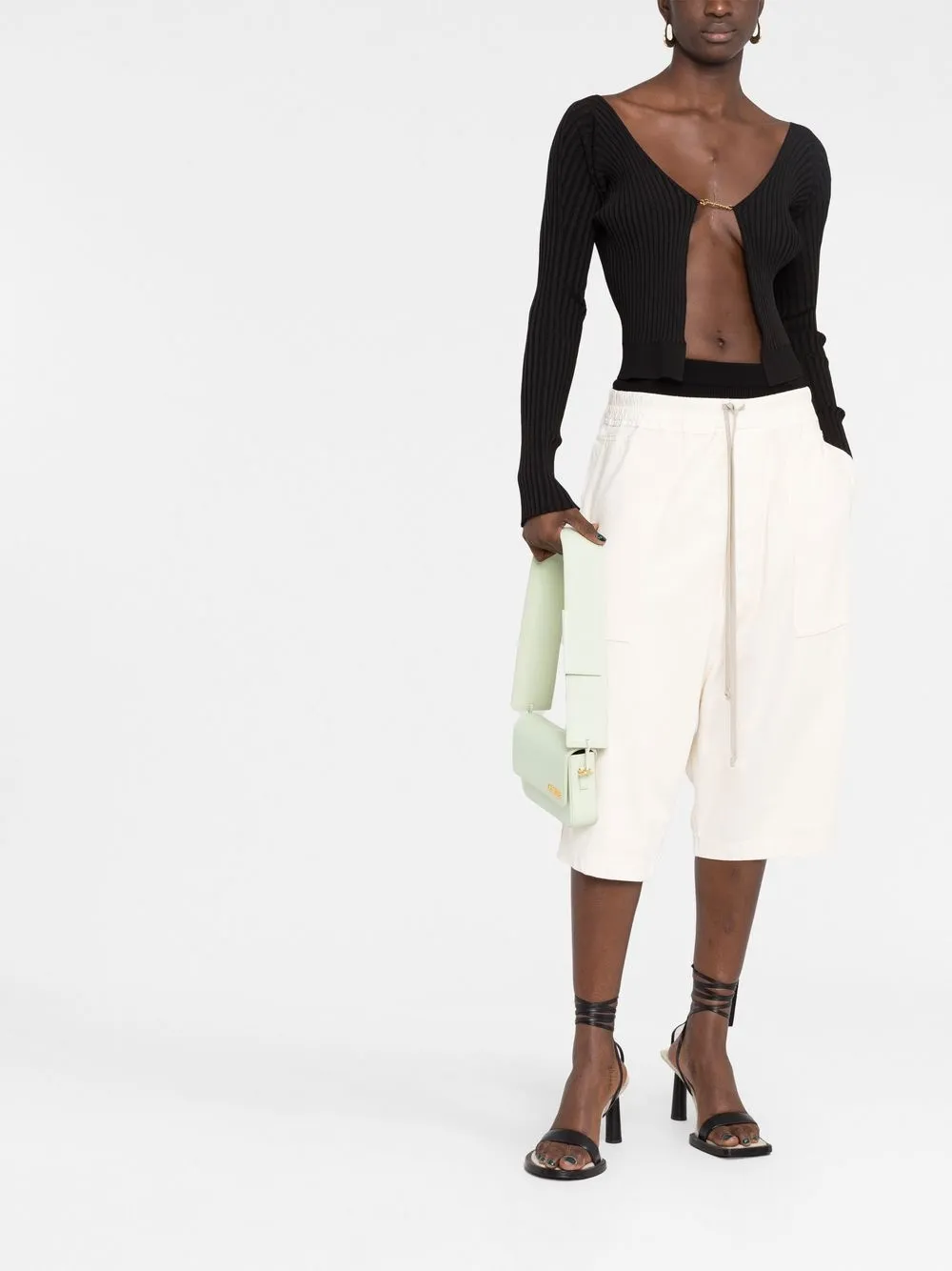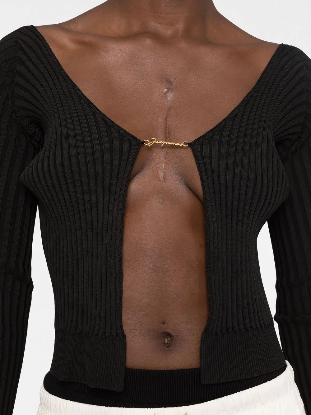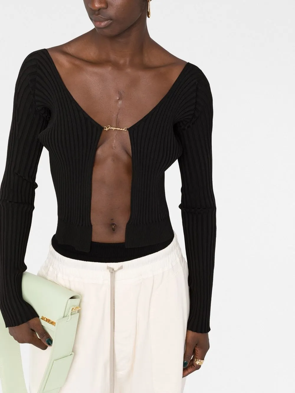 Черный, эластичный материал, трикотаж в рубчик, золотистый логотип, модель без застежки и длинные рукава.