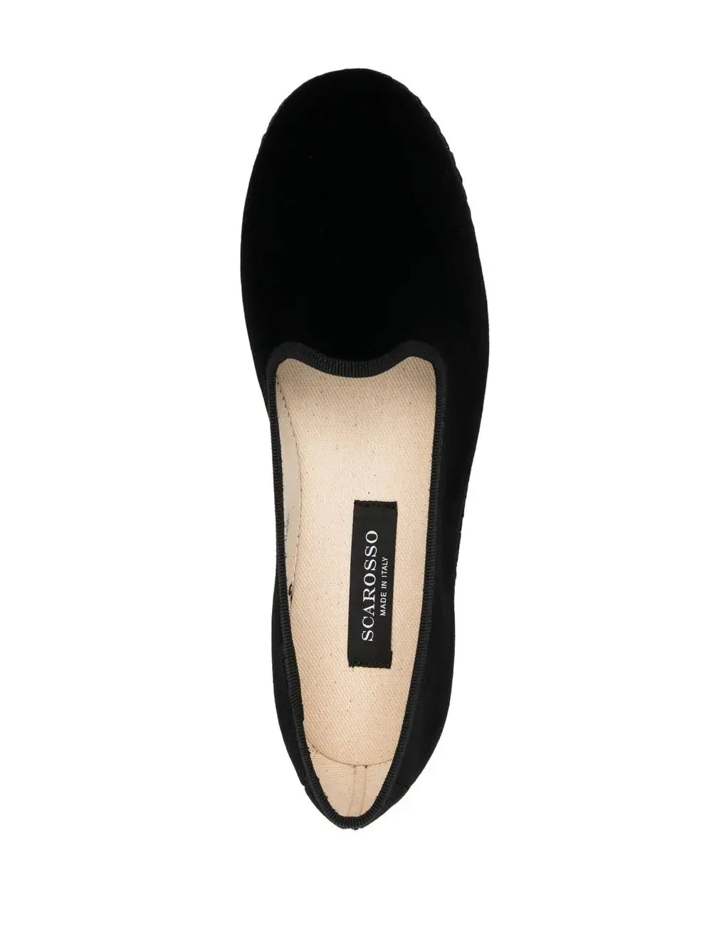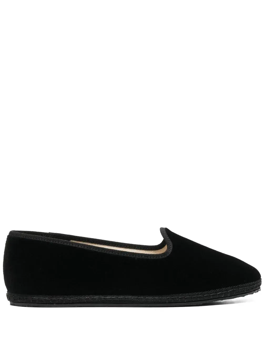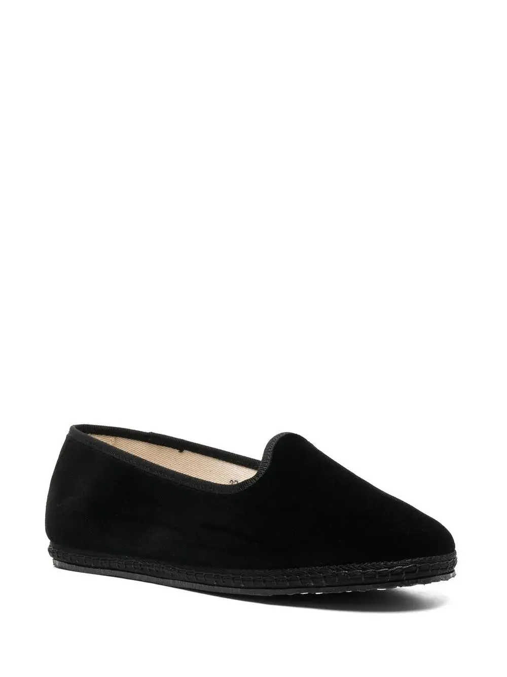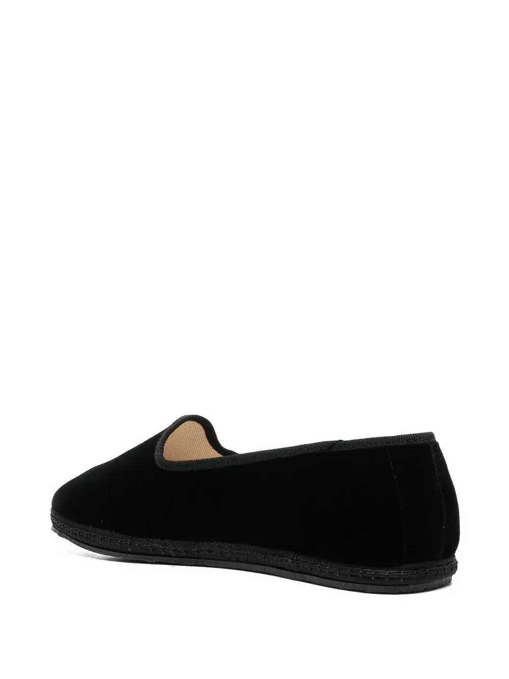 Черный, бархат, объемная окантовка, миндалевидный носок и плоская резиновая подошва.