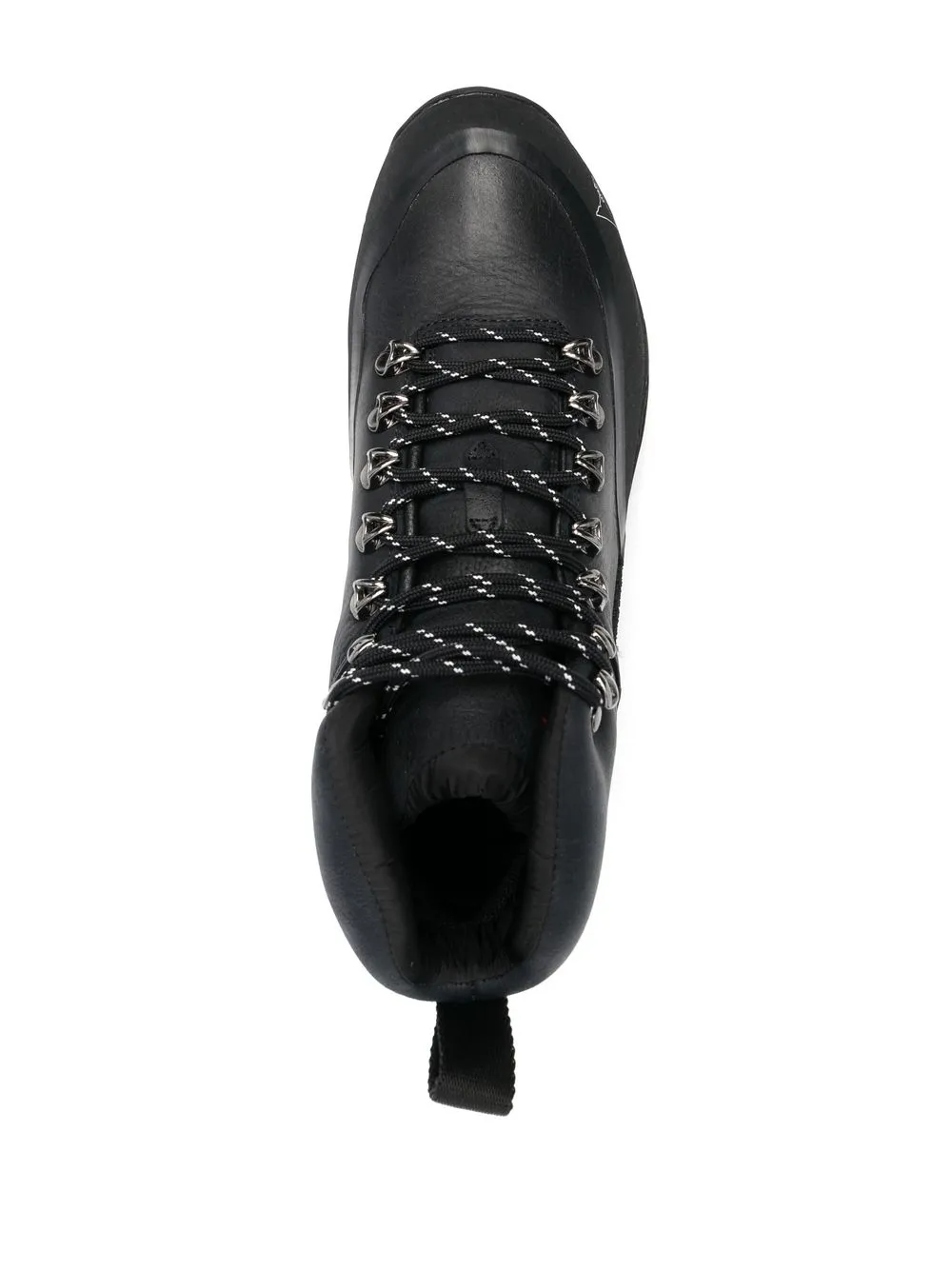 Черный, телячья кожа, шнуровка спереди, петля для подтягивания сзади, плоская резиновая подошва и закругленный носок.