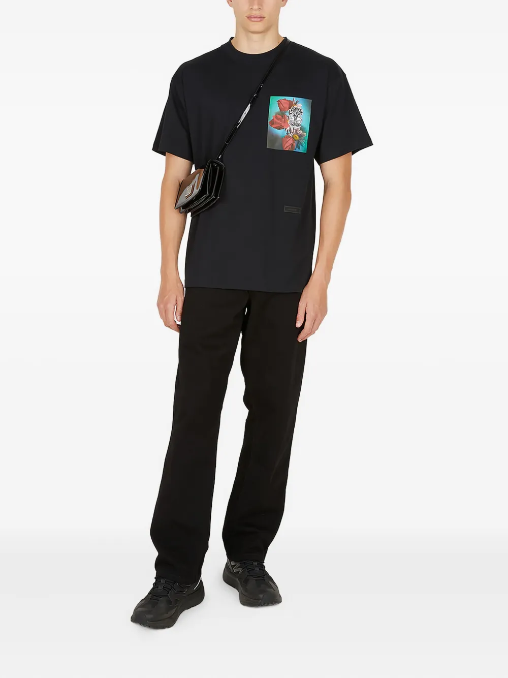 Черный цветочный принт, короткие рукава, графические детали, оригинальные надписи с эффектом памяти
