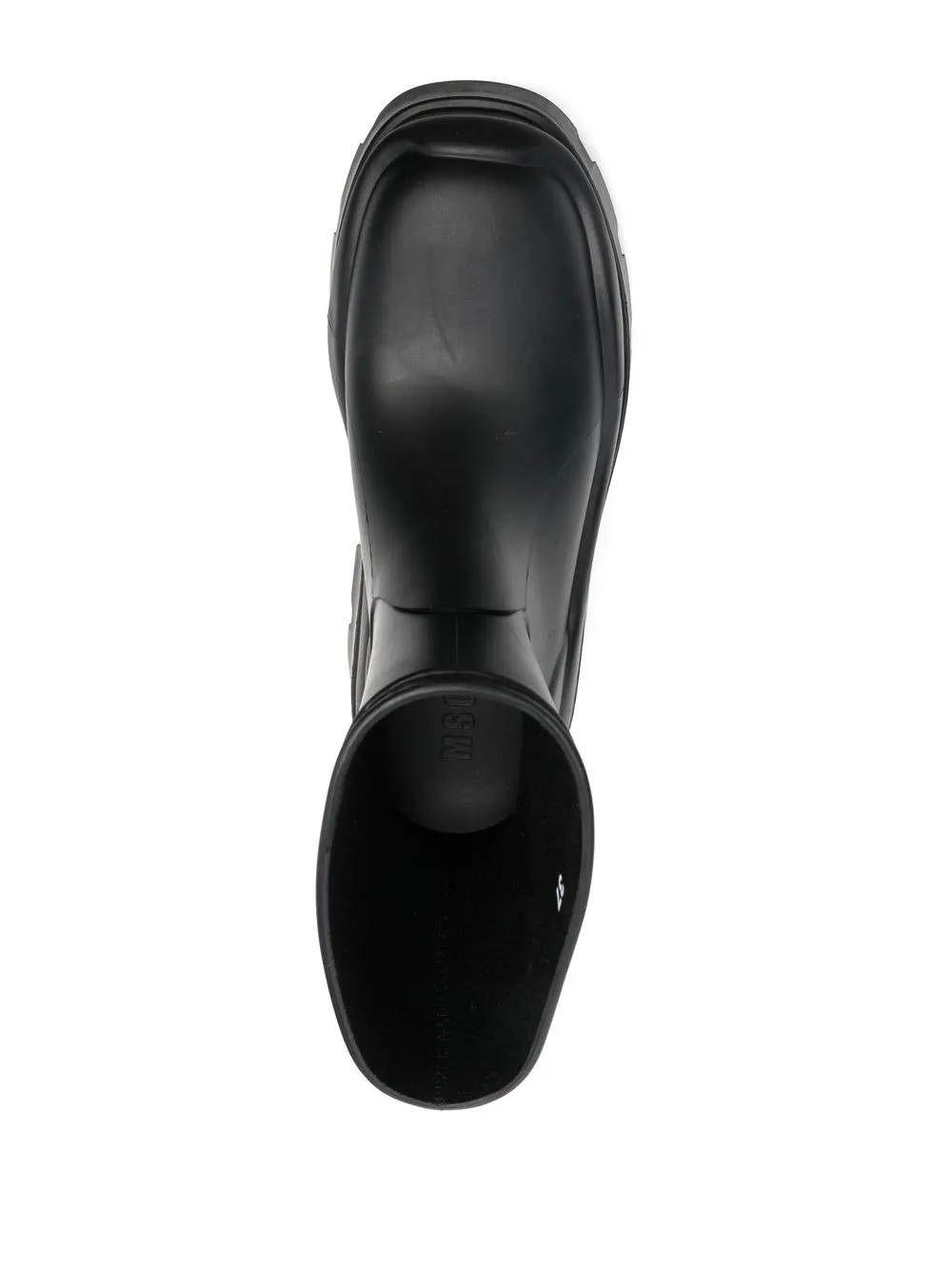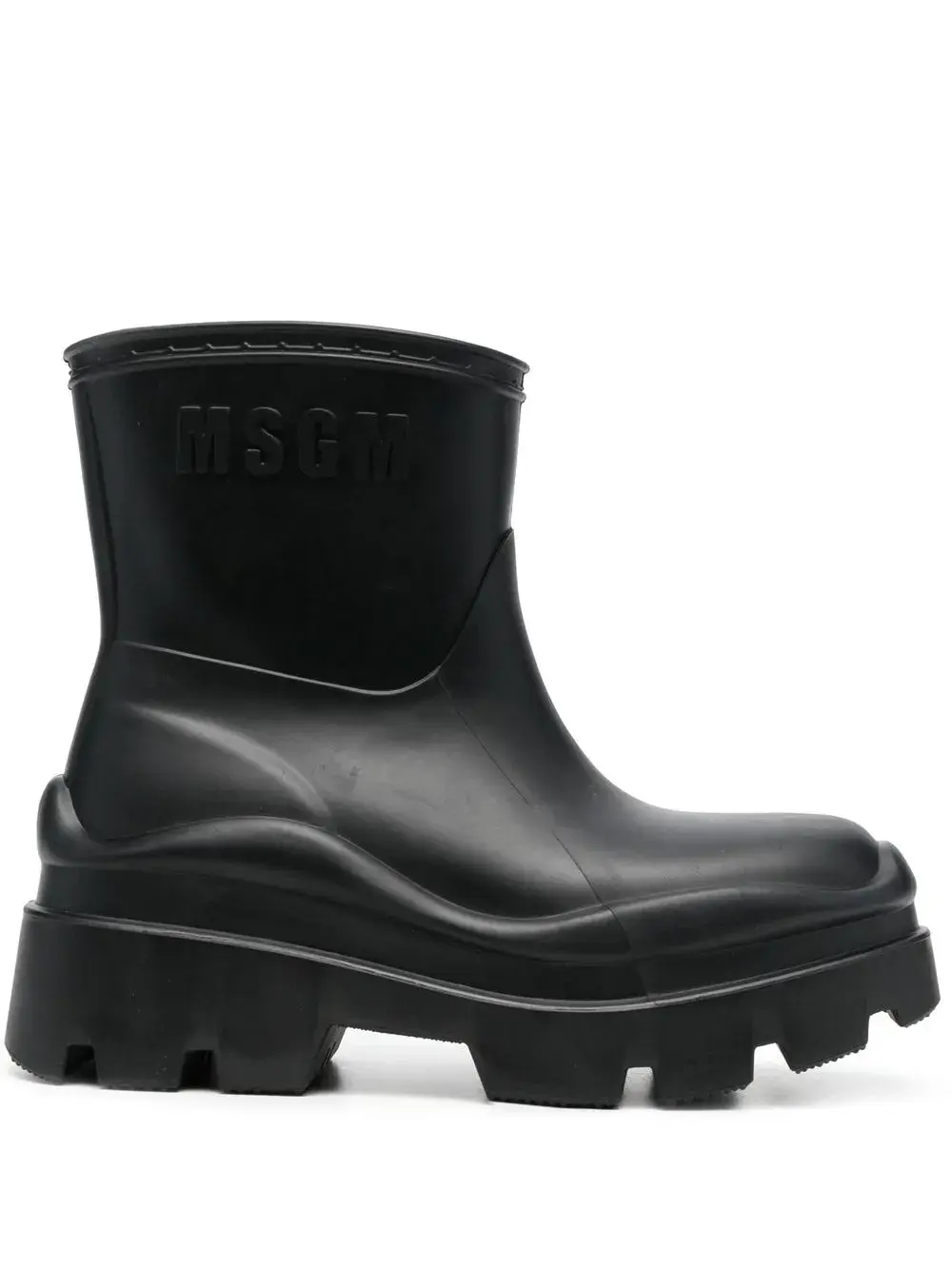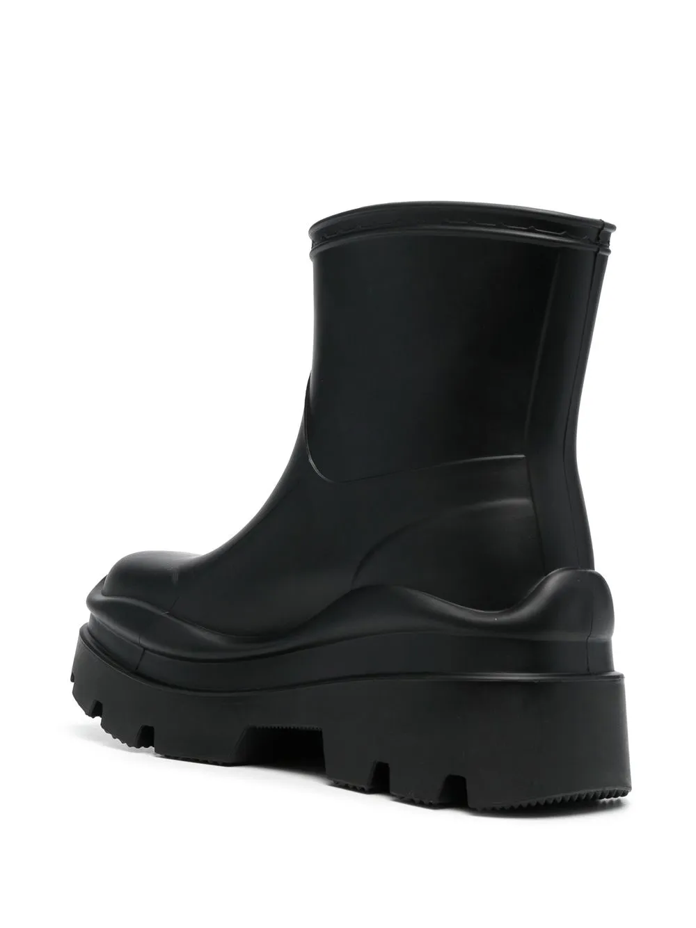 Черный, однотонная расцветка, тисненый логотип сбоку, закругленный носок, рифленая резиновая подошва, высота по щиколотку и модель без застежки.