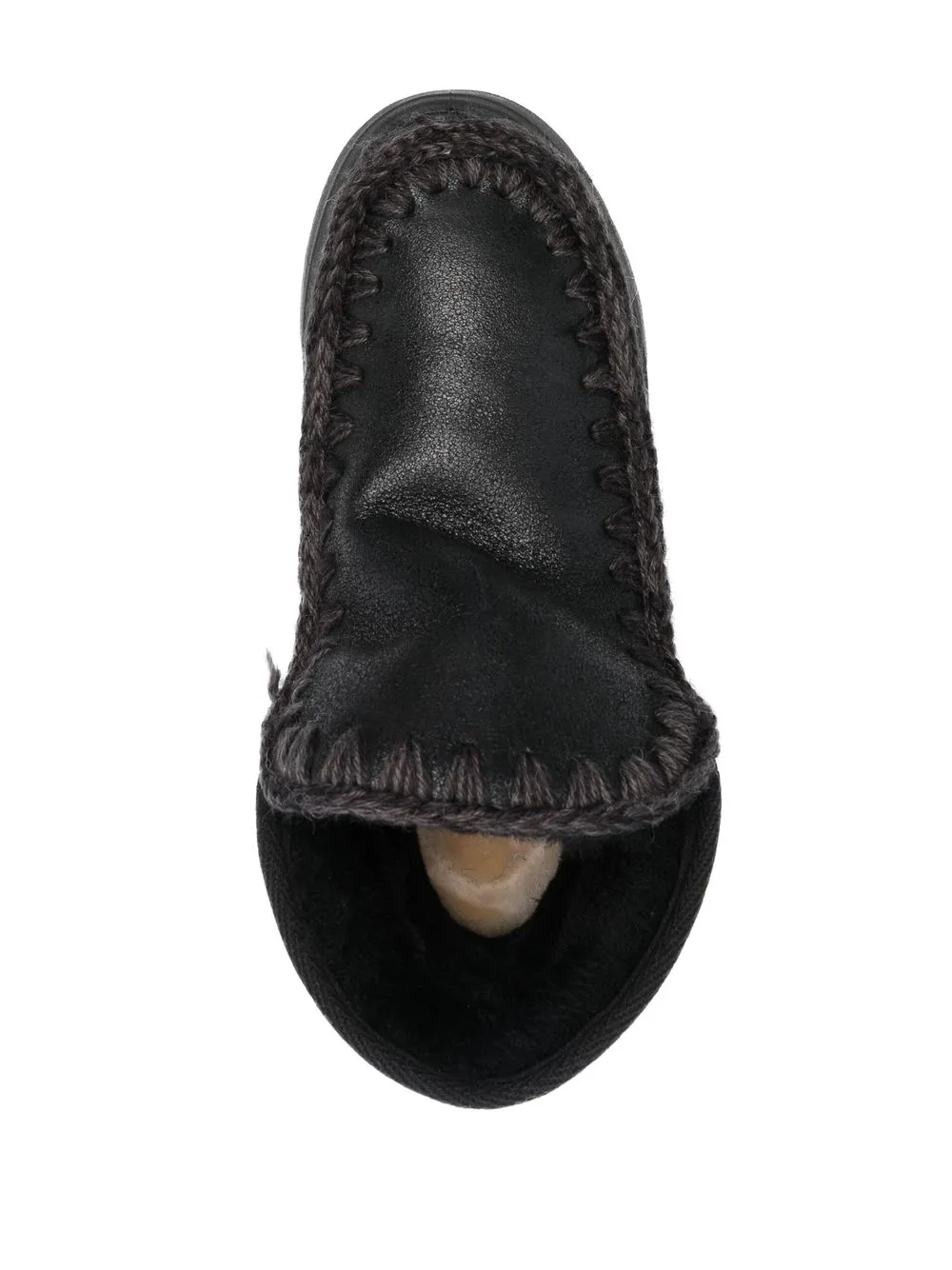 Черный, овечья кожа, подкладка из овечьей шерсти, строчка в тон, нашивка с логотипом сзади, закругленный носок и массивная резиновая подошва.