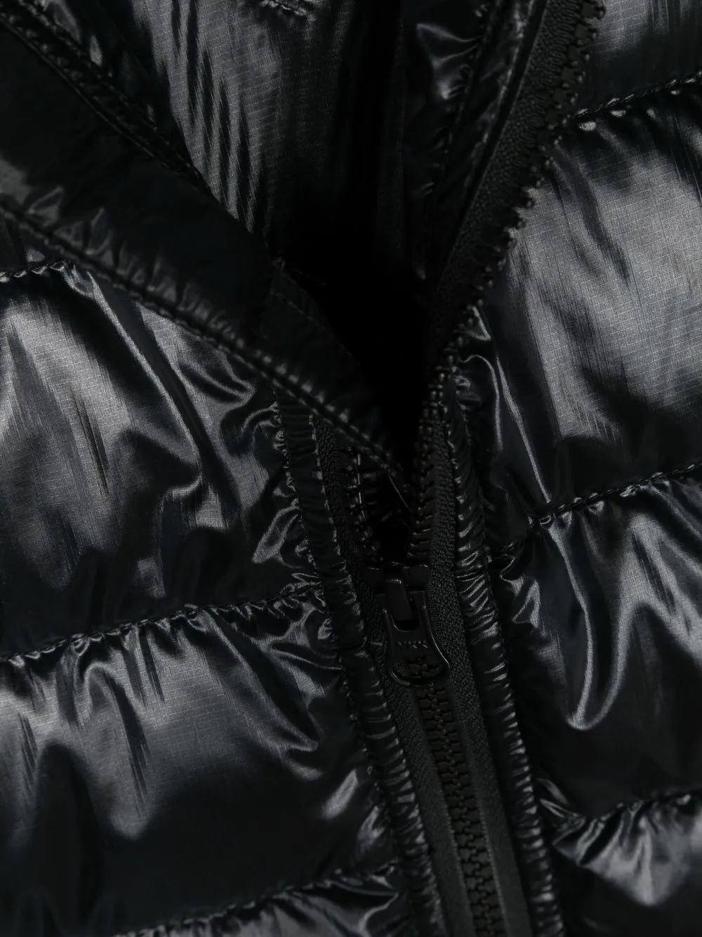 Черный, наполнитель из пуха и перьев, нашивка с логотипом на рукаве, стеганая отделка, два кармана на молнии по бокам, застежка на молнии спереди, классический капюшон, длинные рукава и эластичные манжеты.