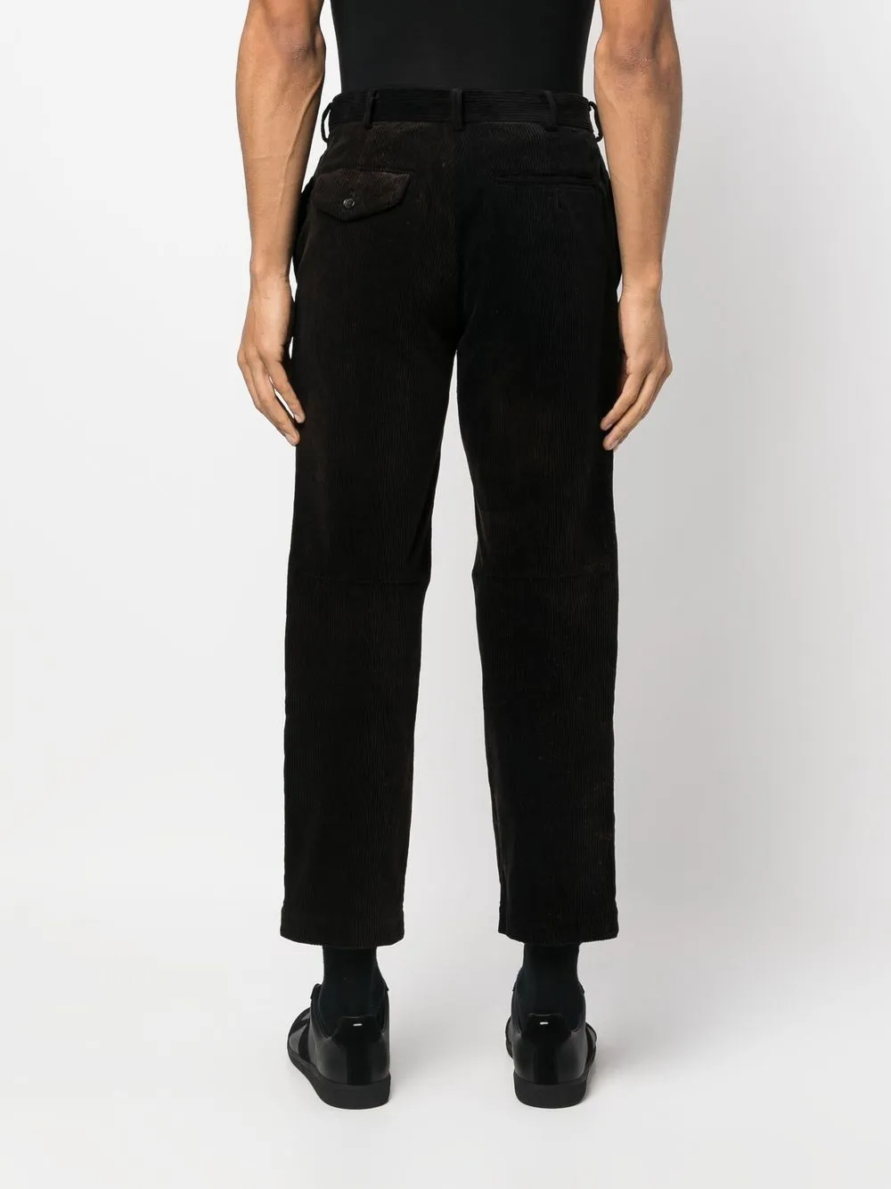 Петли для ремня, ширинка на пуговицах, два кармана по бокам, два кармана с клапанами сзади и укороченная длина.
