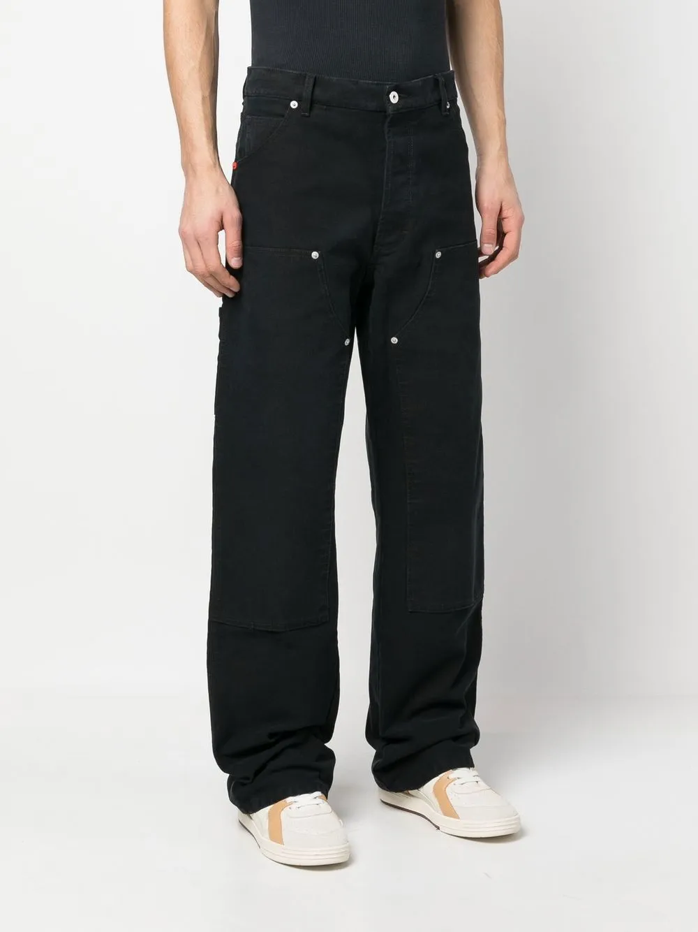 Черный, хлопок, средняя посадка, застежка на пуговицах спереди, ширинка на молнии, петли для ремня, пять карманов, два накладных кармана по бокам, два накладных кармана спереди, серебристая фурнитура, принт с логотипом сзади и прямой крой.
