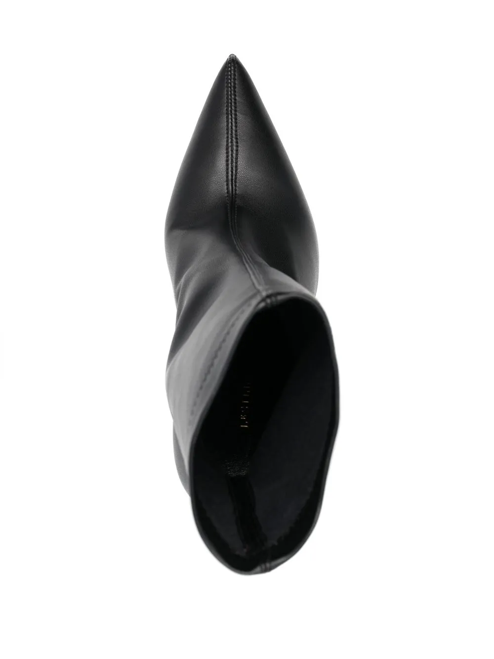 Черный, искусственная кожа, козья кожа, кожа, заостренный носок, модель без застежки, высота по щиколотку, каблук на высокой шпильке, стелька с логотипом и кожаная подошва.
