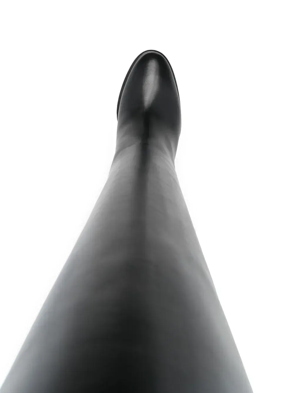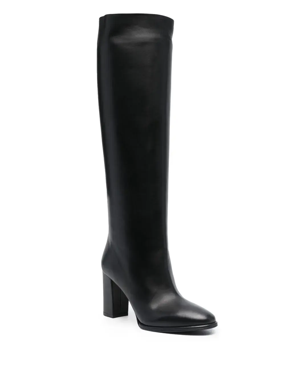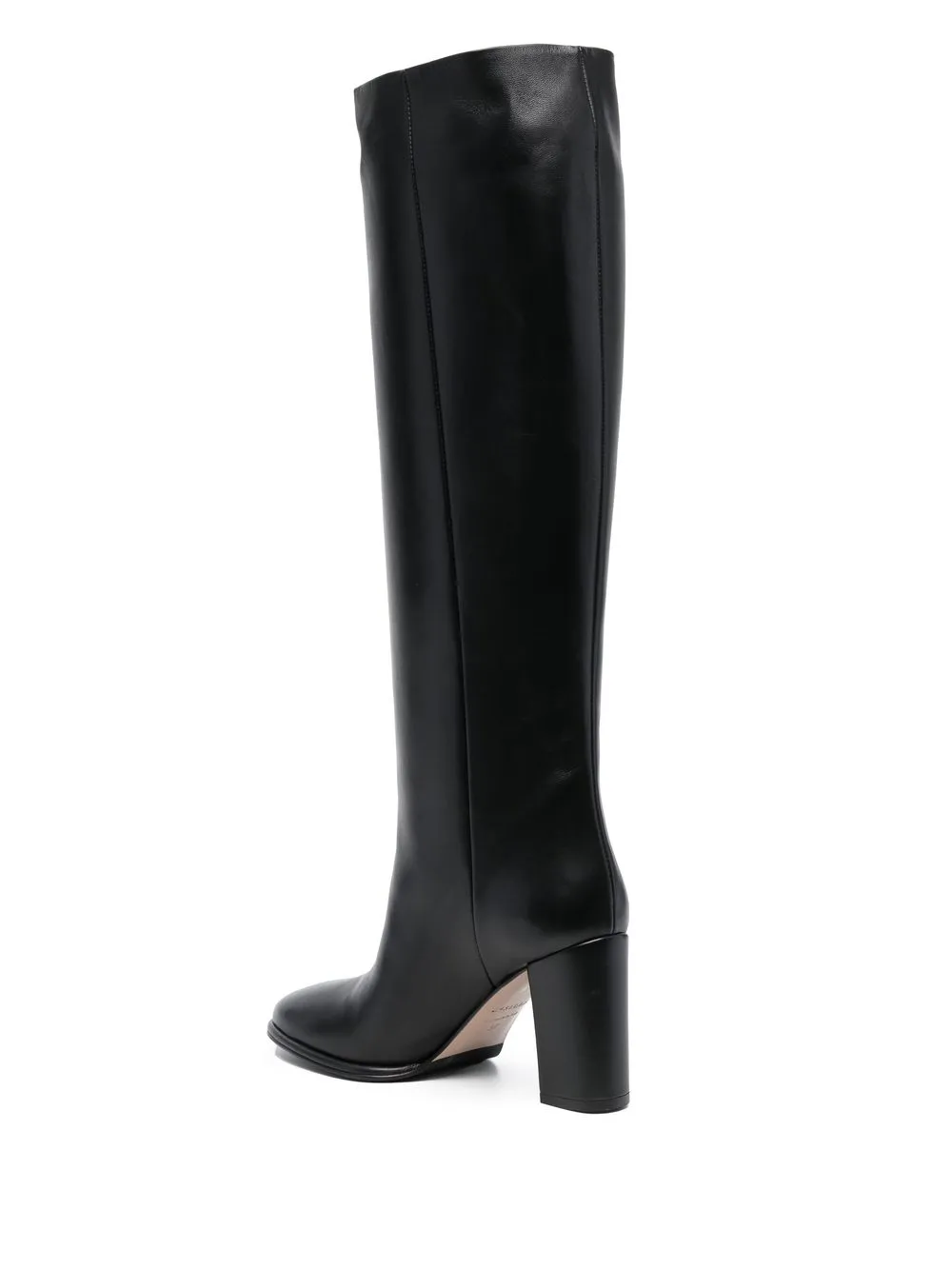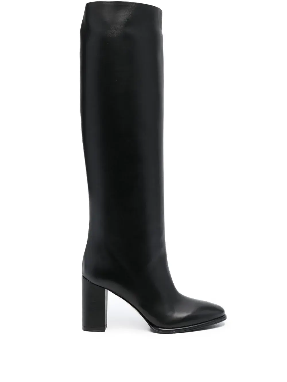Черный, кожа наппа, козья кожа, телячья кожа, высокий блочный каблук, миндалевидный носок и высота по колено.
