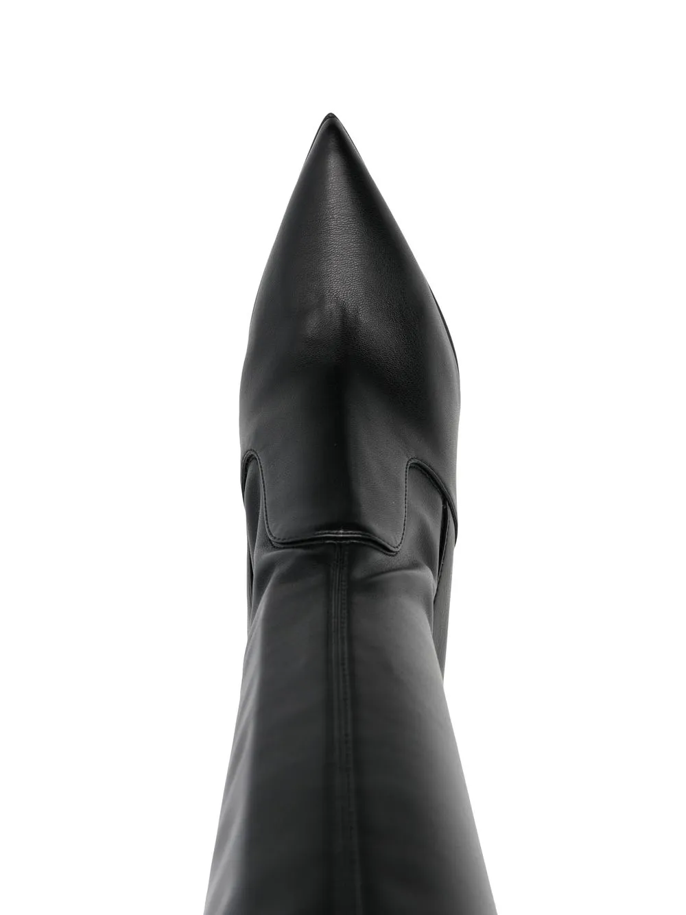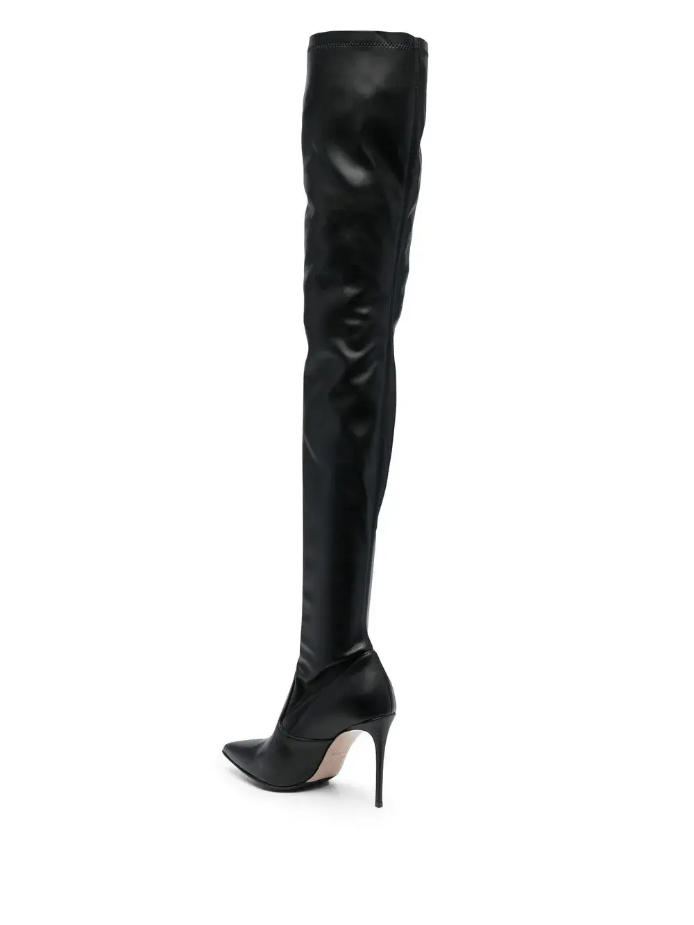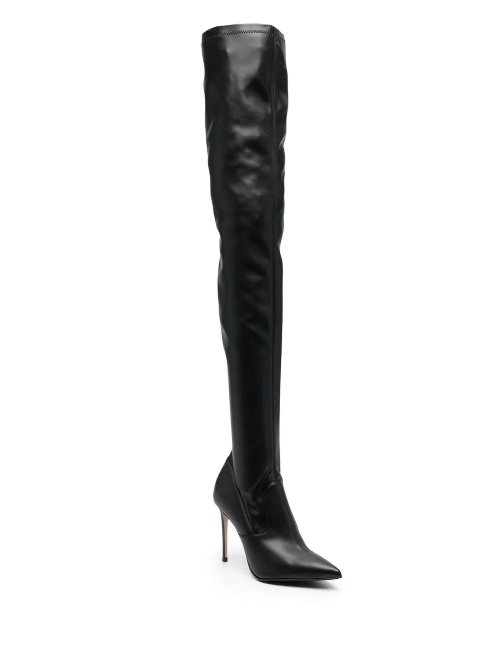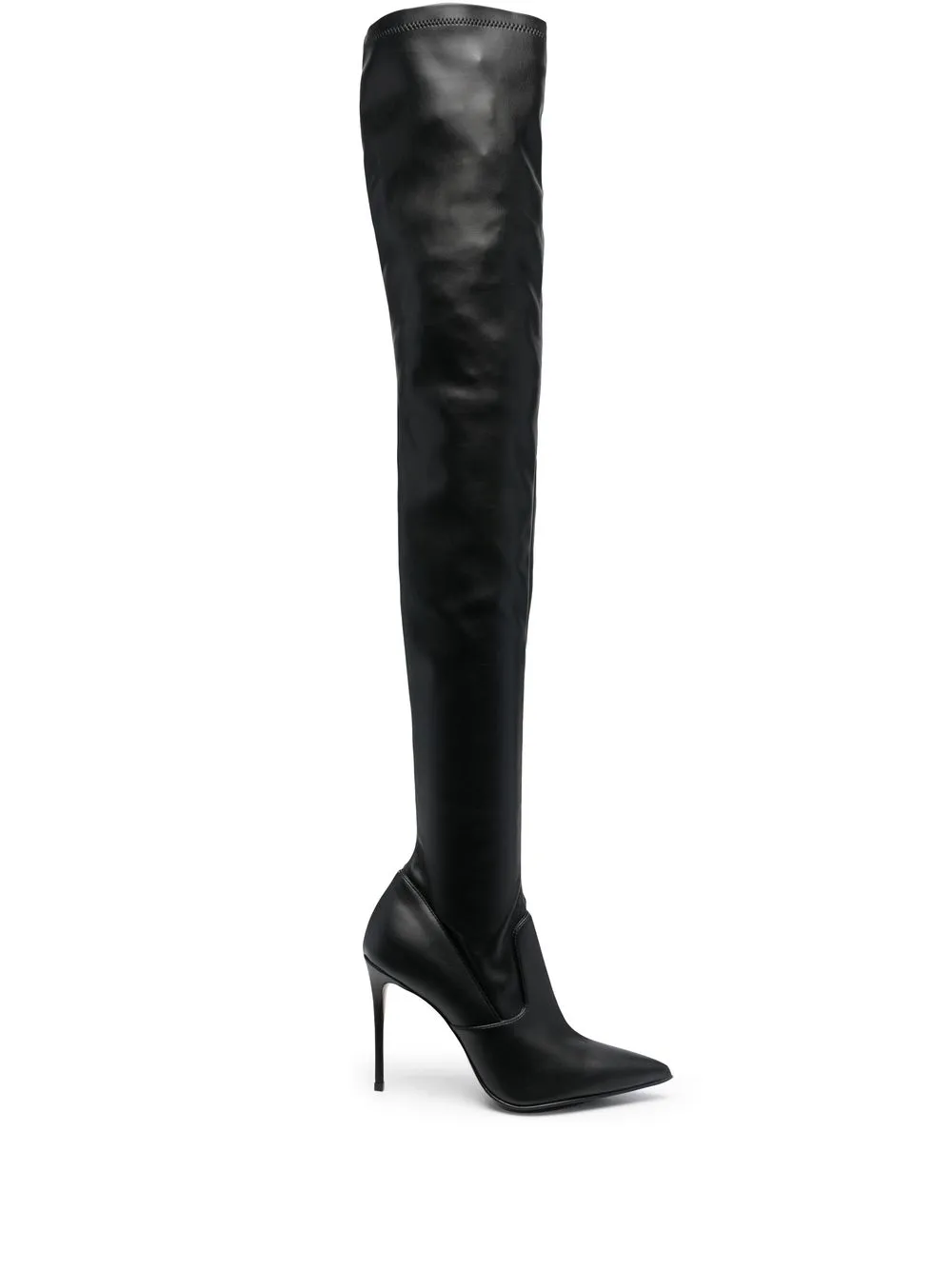 Черный, телячья кожа, заостренный носок, высота до линии бедра, каблук-шпилька и модель без застежки.