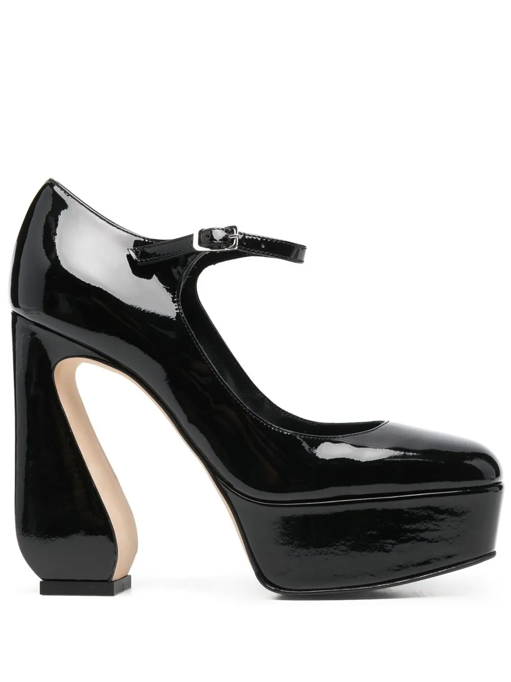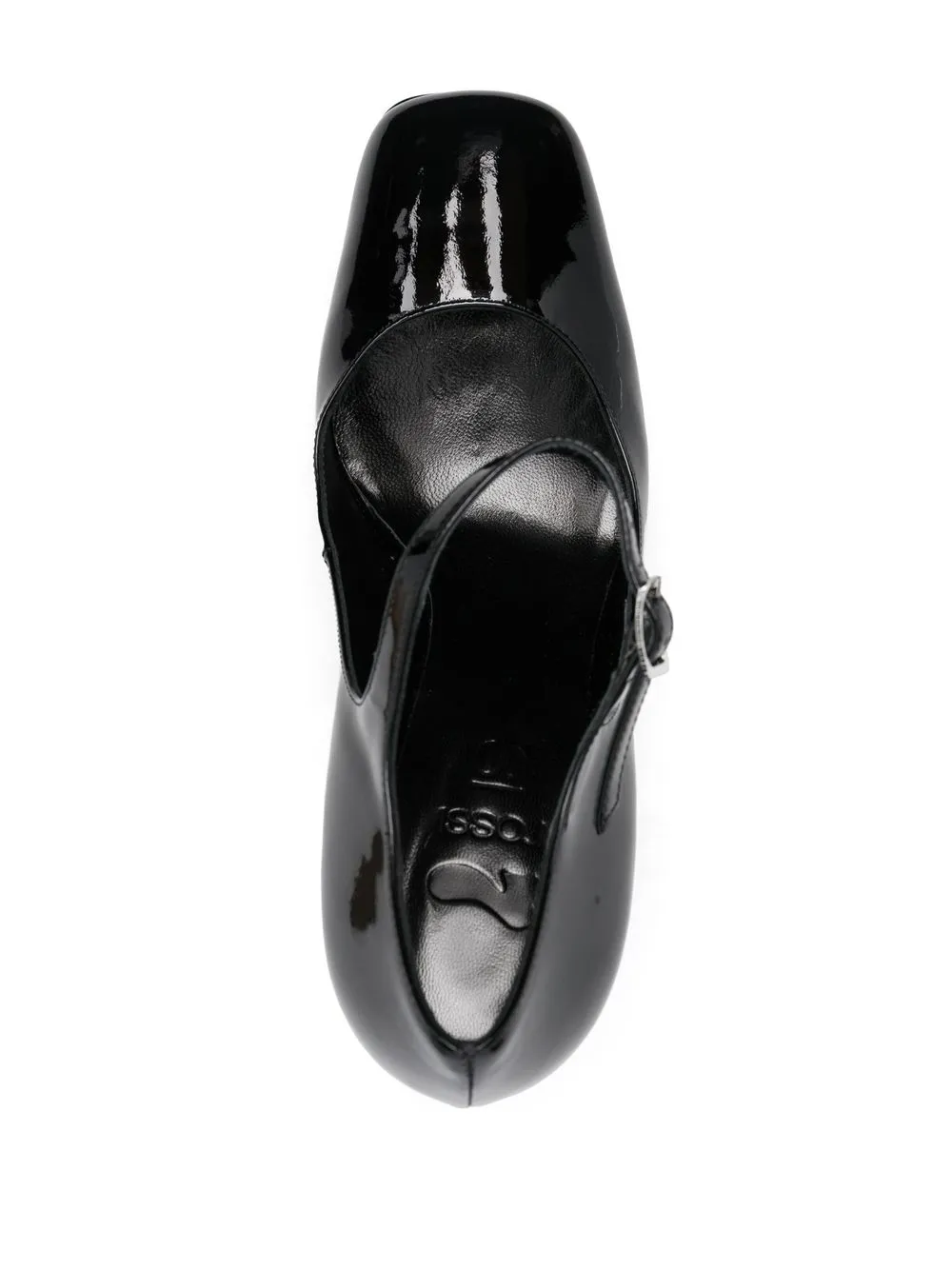 Черный, телячья кожа, лакированная отделка, кожаная подкладка, квадратный носок, ремешок на щиколотке с пряжкой, стелька с логотипом и высокий блочный каблук.