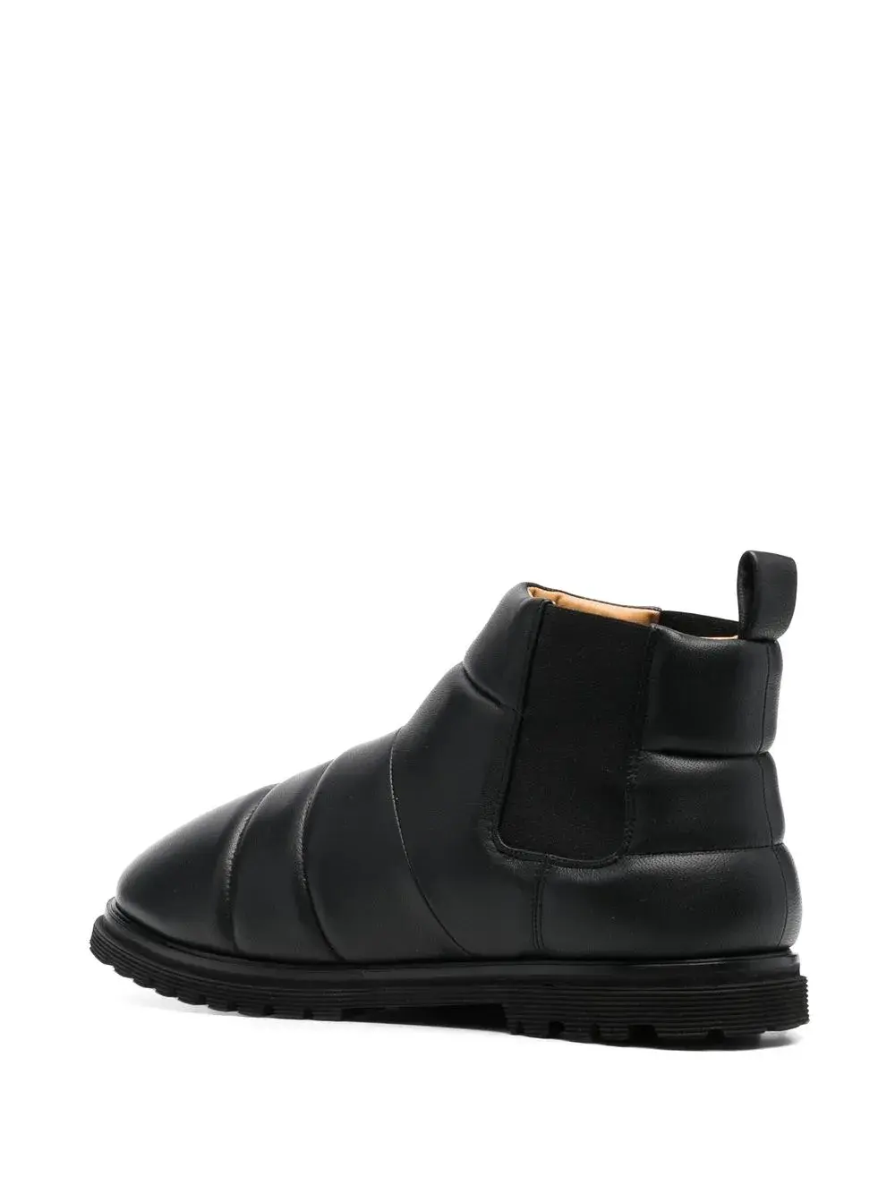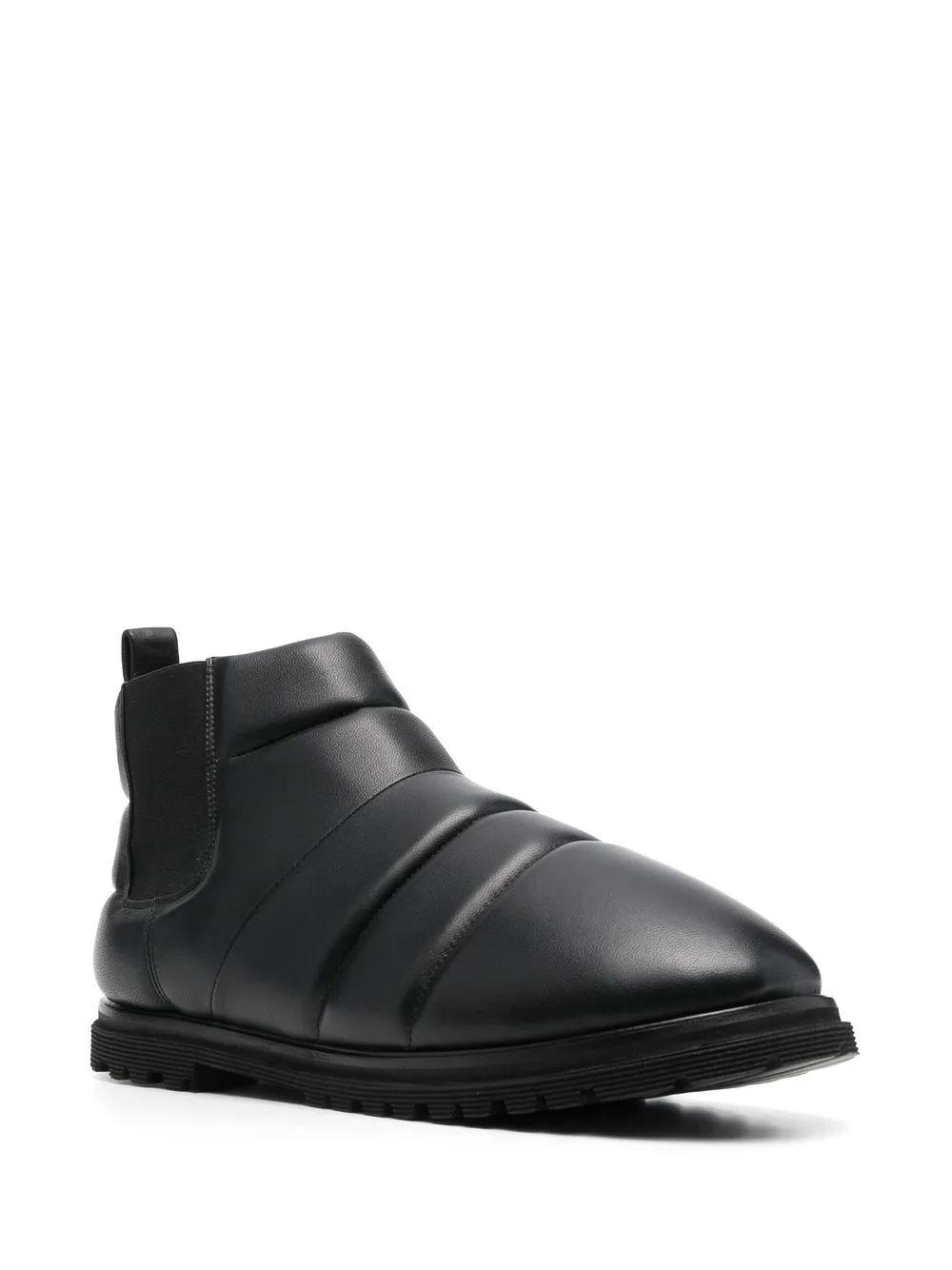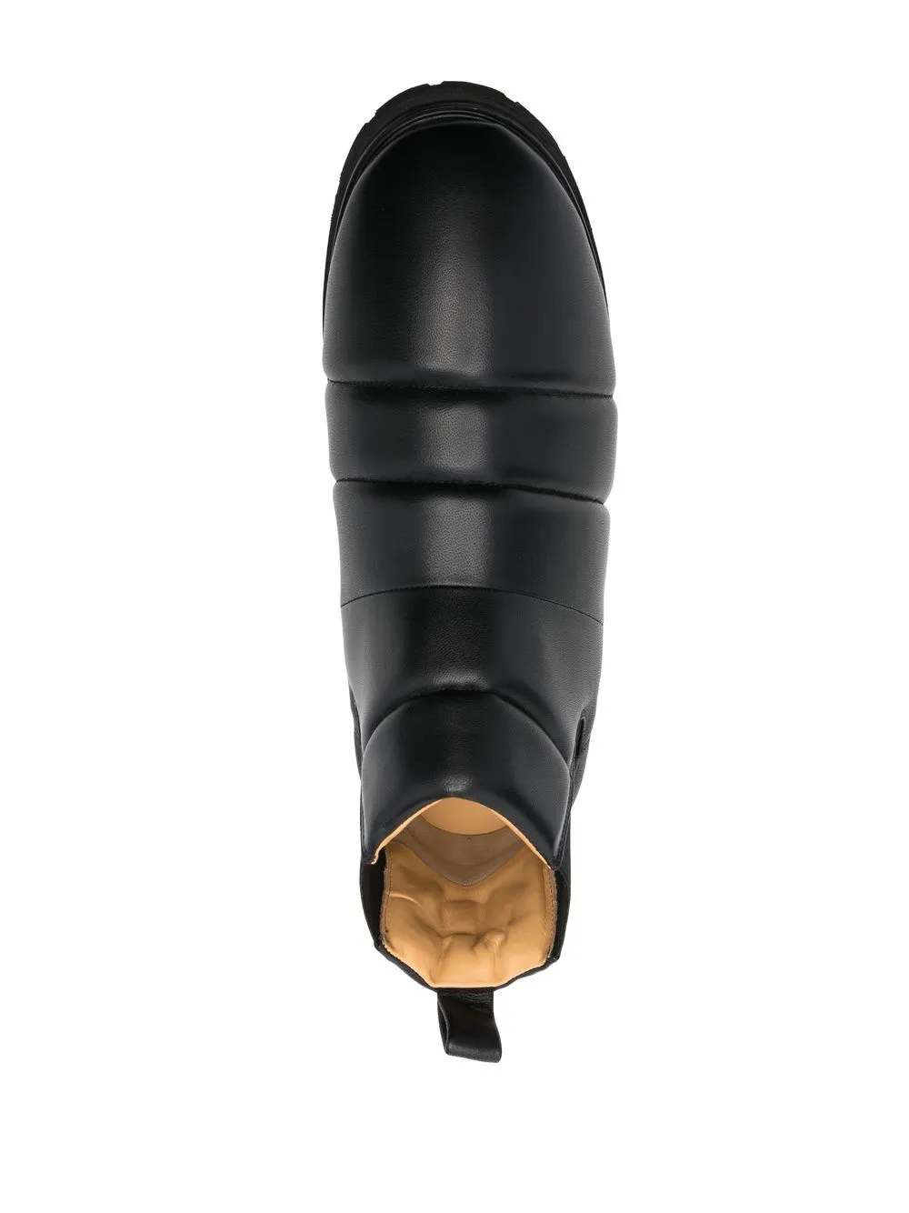 Черный, телячья кожа, дутый материал, петля для подтягивания сзади, закругленный носок, модель без застежки и плоская резиновая подошва.