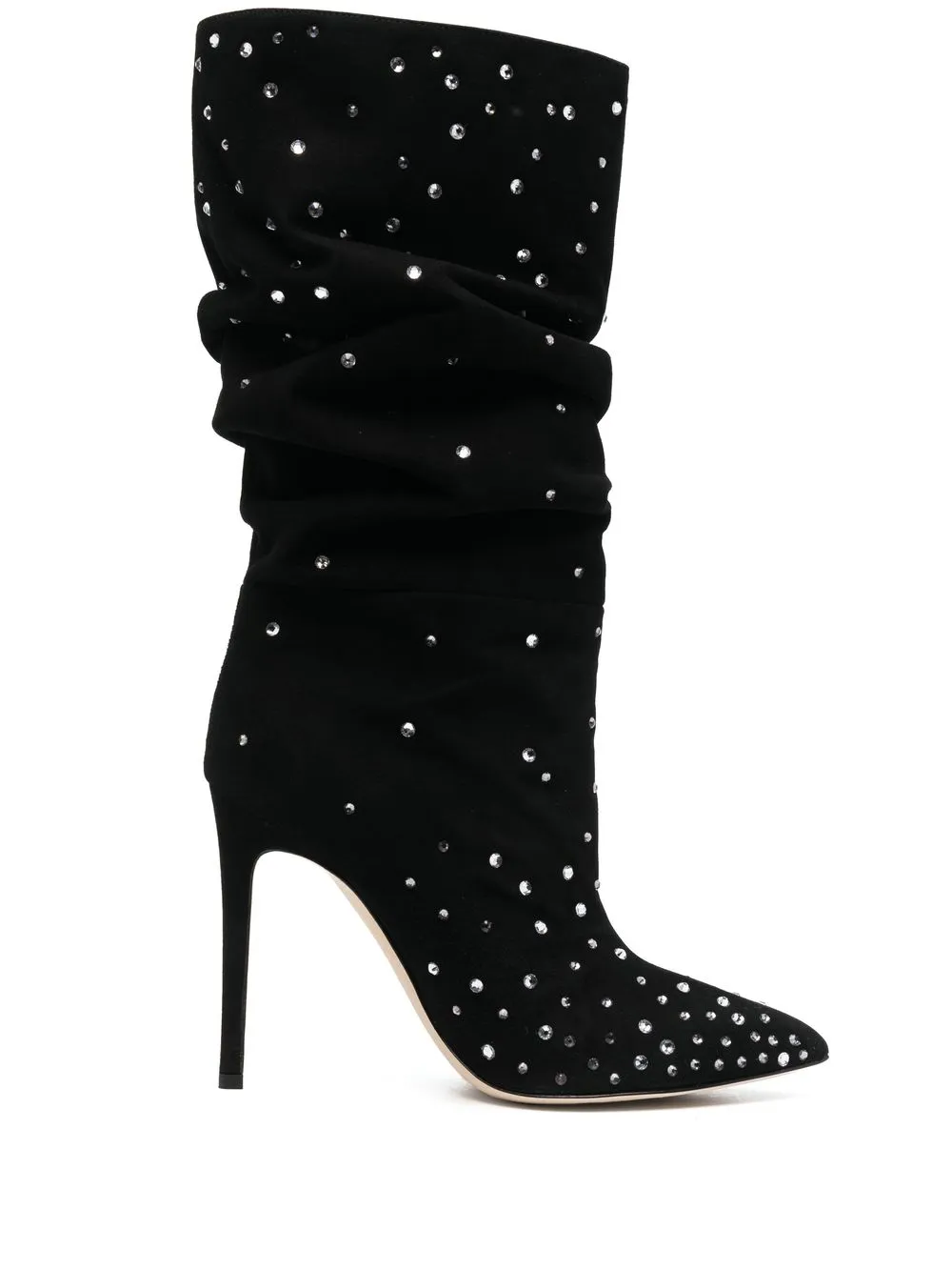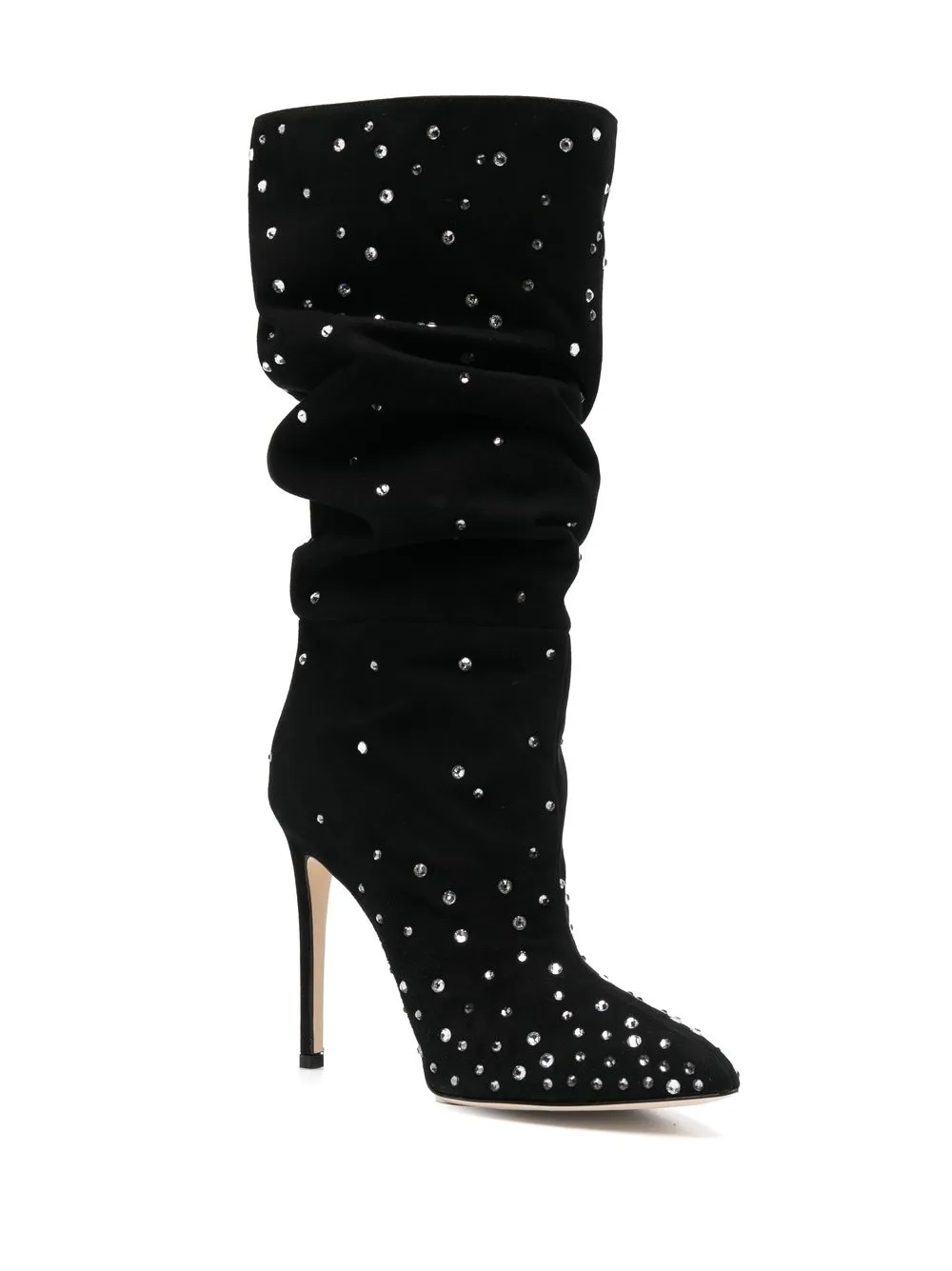 Декор из кристаллов, детали с оборками, длина до середины икры, заостренный носок и высокий каблук.