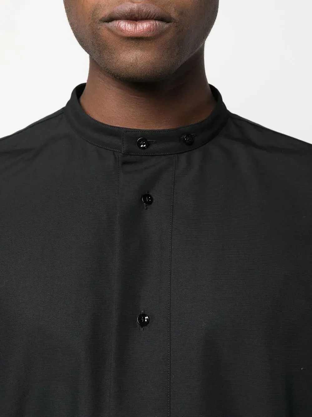 Черный, хлопок, поплин, воротник-стойка, застежка на пуговицах спереди, рукава с манжетами на пуговицах и прямой подол.