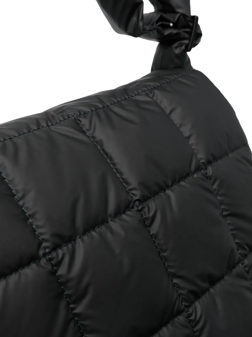 Черный, переработанный нейлон, дутый материал, откидной клапан и регулируемый ремень на плечо.