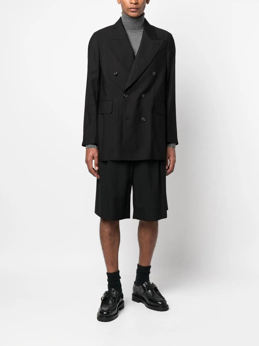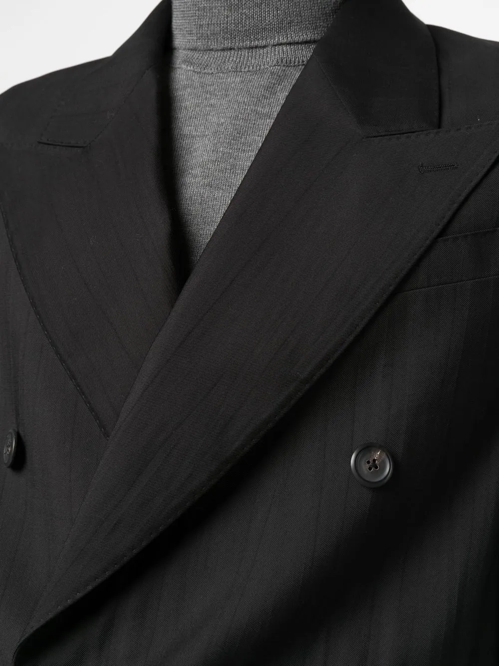 Жатый эффект, два кармана с клапанами по бокам, двубортная застежка на кнопки, зазубренные лацканы, длинные рукава и прямой подол.