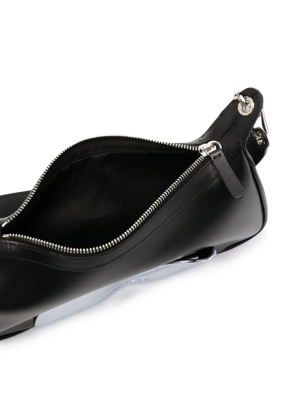 Серебристая фурнитура, тисненый логотип спереди, ремень на плечо, застежка на молнии сверху и ремешок-цепочка на плечо.