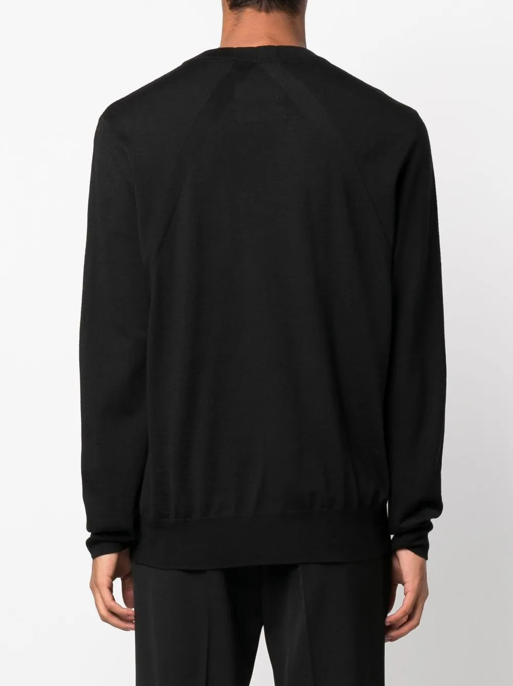 Черный, шерсть, тонкая вязка, круглый вырез, манжеты в рубчик, подол в рубчик, длинные рукава и прямой подол.