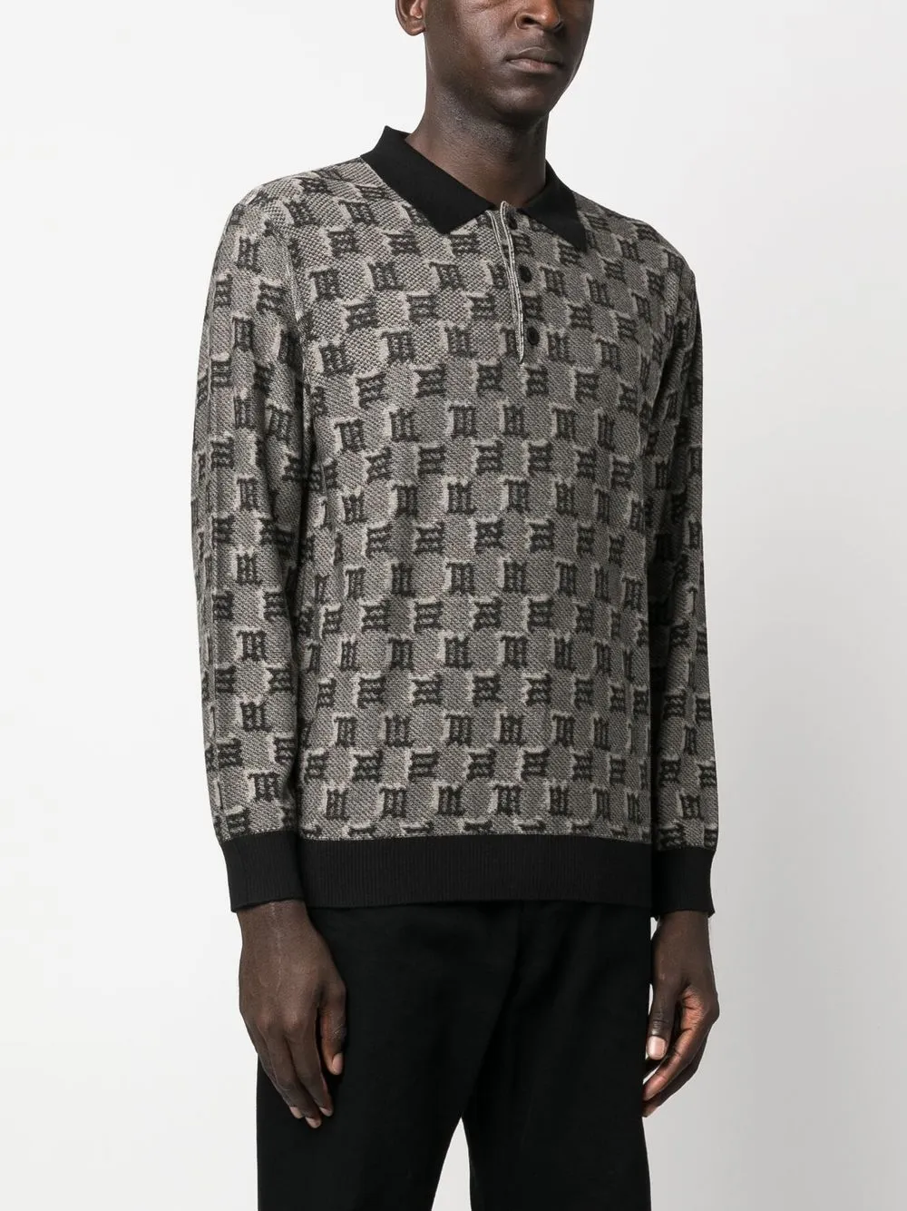 Черный/серый смесь шерсти и шелка жаккардовый логотип воротник поло планка на пуговицах спереди длинные рукава контрастные манжеты