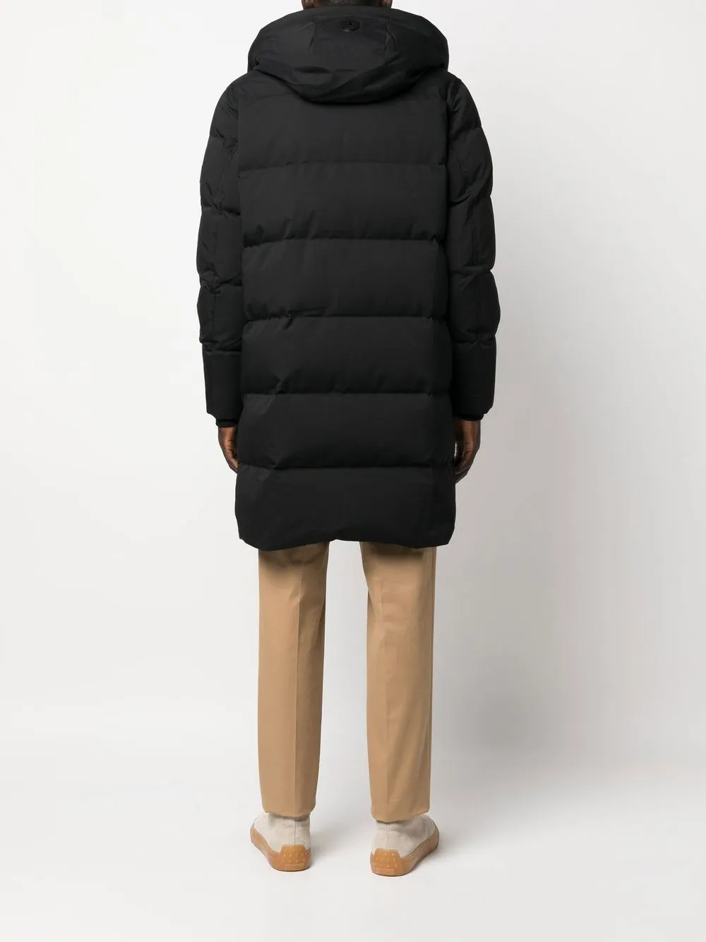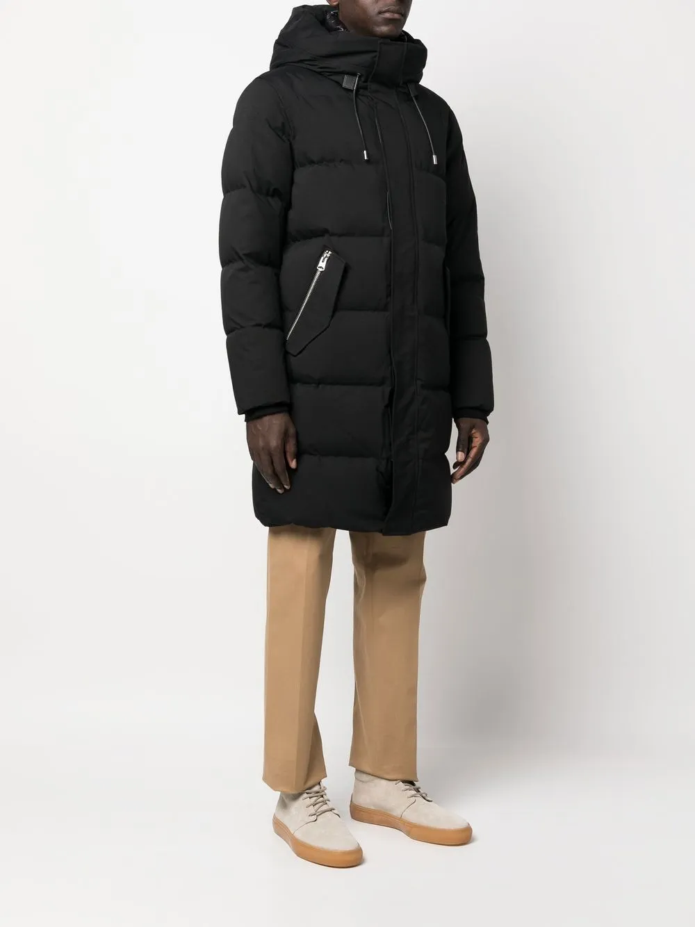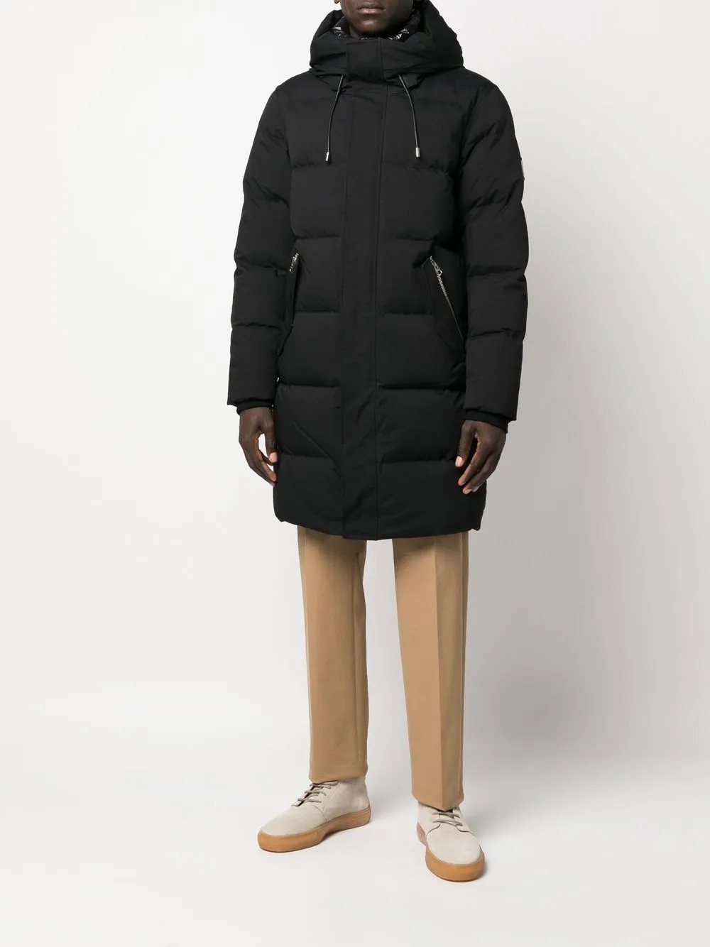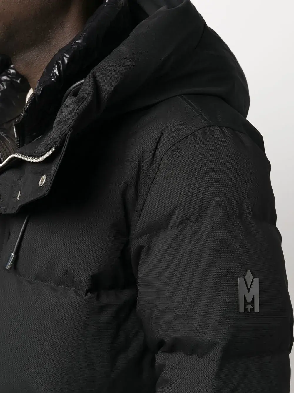 Черный, утиные перья, дутый материал, логотип сбоку, классический капюшон, застежка на молнии спереди, длинные рукава и два кармана на молнии по бокам.