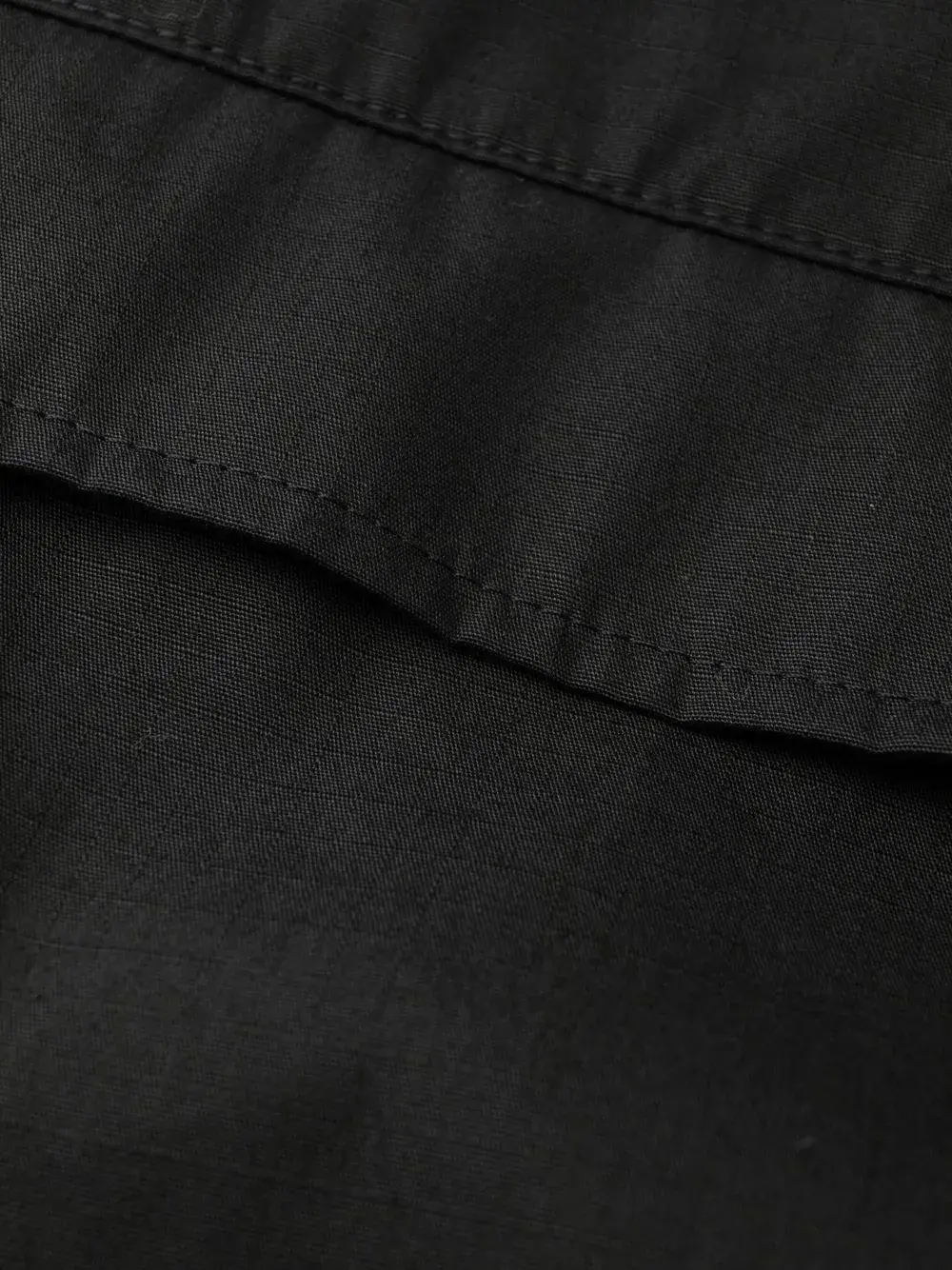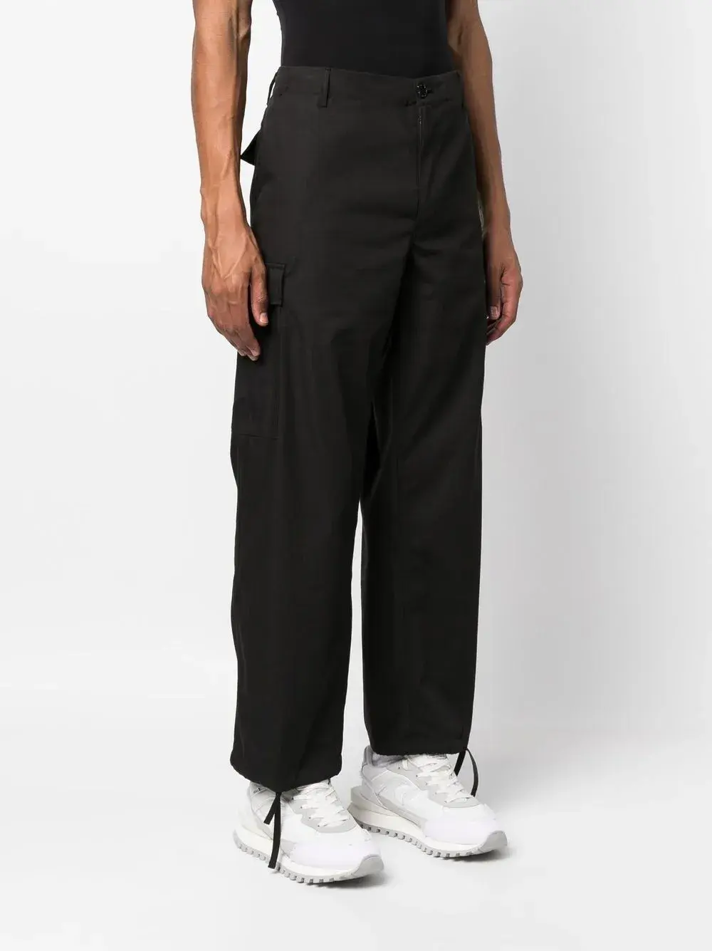 Черный, хлопок, нашивка с логотипом сзади, петли для ремня, потайная застежка на молнии и пуговицах, накладные карманы и прямой крой.