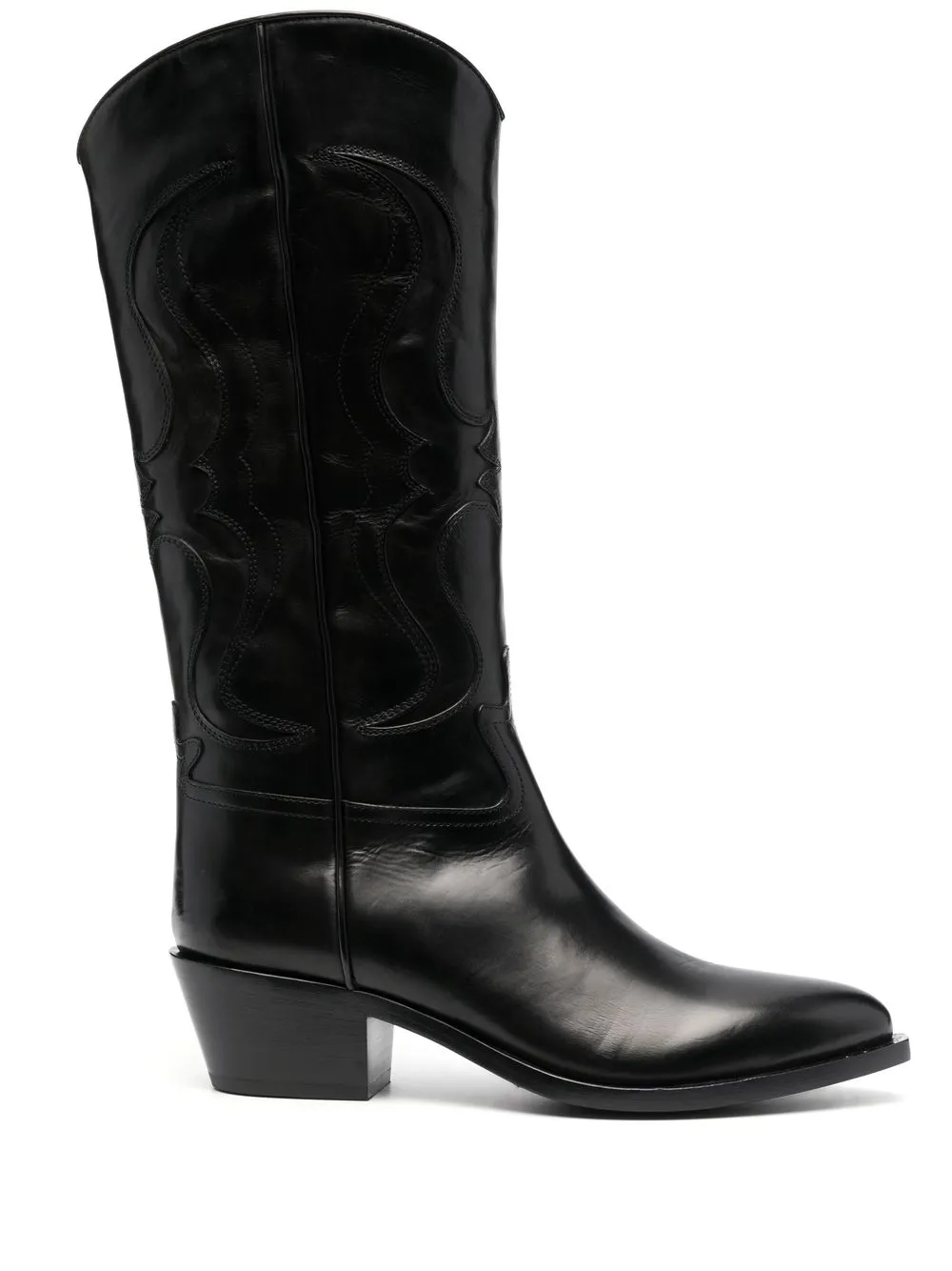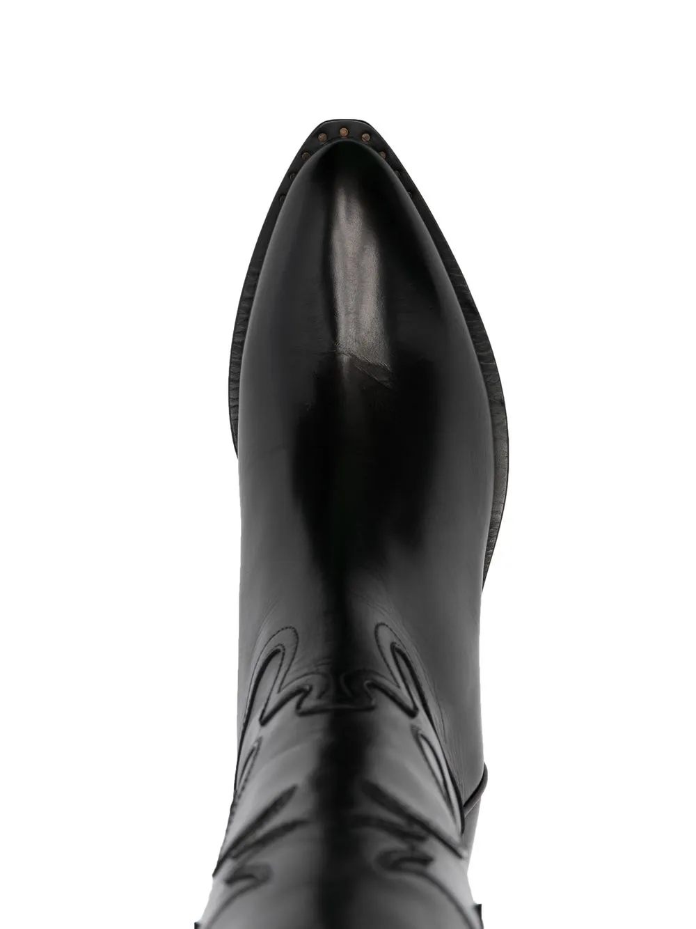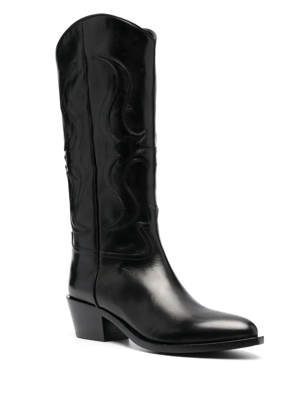 Черный, телячья кожа, вставки в стиле вестерн, строчка в тон, заостренный носок, высота по колено, кубинский каблук и модель без застежки.