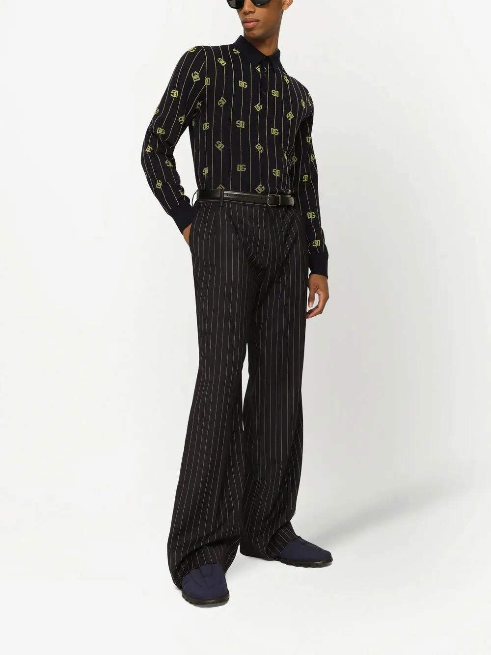 Черный, необработанная шерсть, узор в тонкую полоску, жаккардовый логотип, воротник поло, планка на пуговицах спереди и длинные рукава.