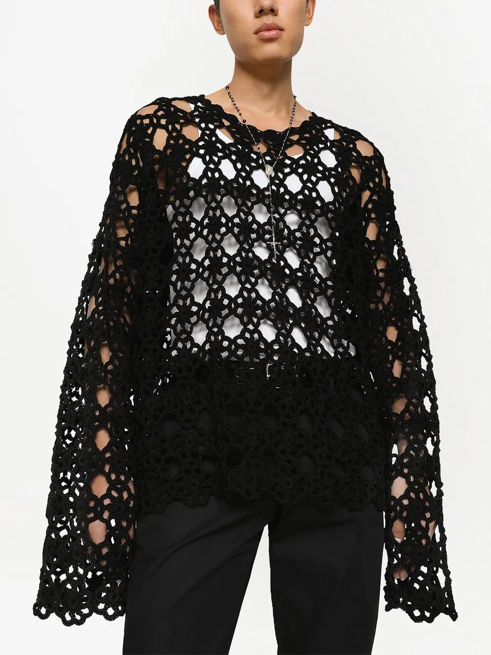Черный, хлопок, кроше, цветочная деталь, вырезные детали, круглый вырез, длинные рукава, прямой подол и края с фестонами.