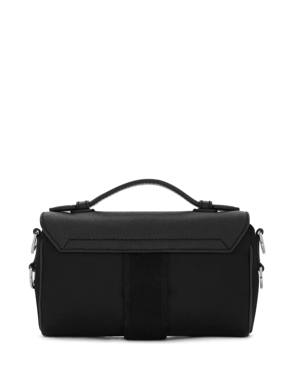 Черный, серебристый металлический логотип, ручка с плоским верхом, откидной клапан, застежка на пряжке, съемный регулируемый ремень на плечо и основное отделение.