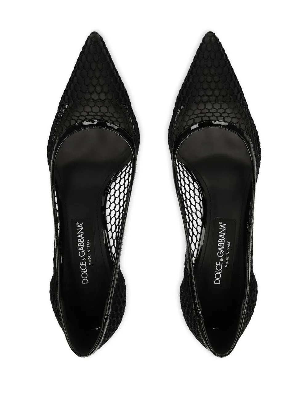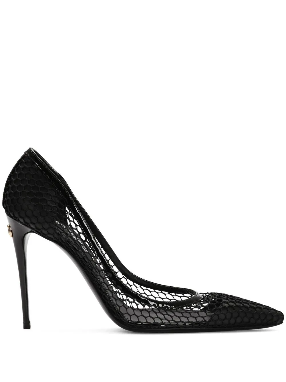 Черный, сетка, золотистый логотип, стелька с логотипом, заостренный носок, каблук на высокой шпильке и модель без застежки.