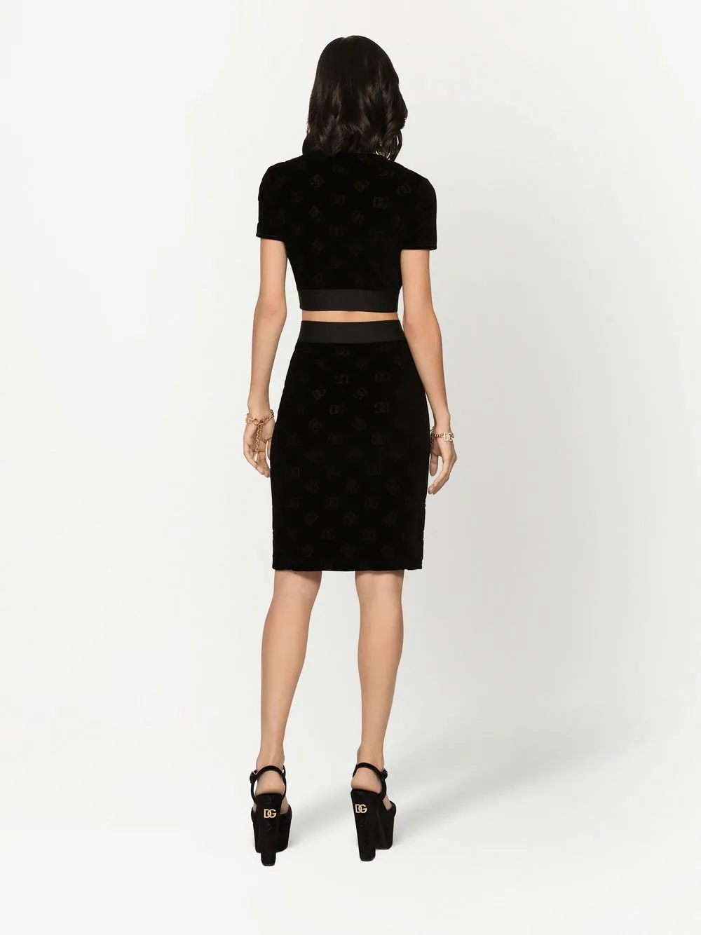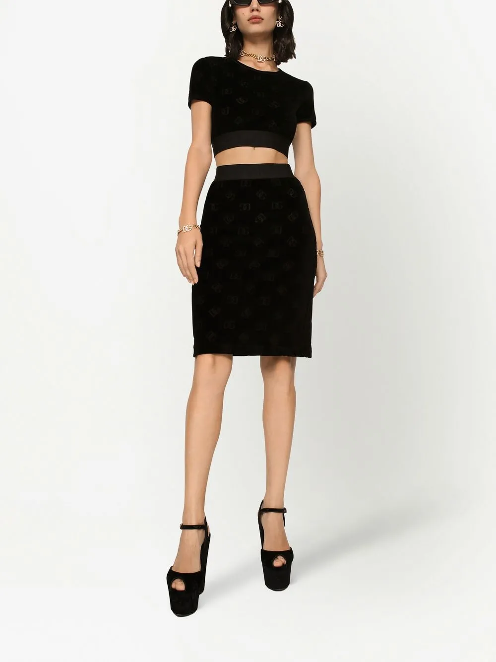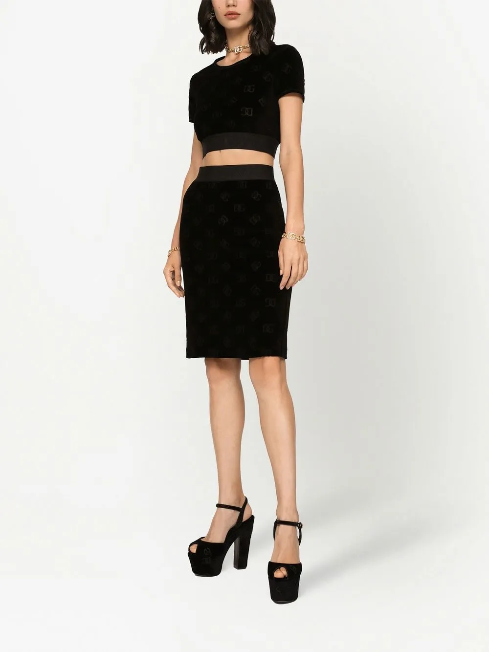 Черный, хлопок, бархат, эластичный материал, узор с изображением монограммы, круглый вырез, короткие рукава, пояс с логотипом и укороченная длина.