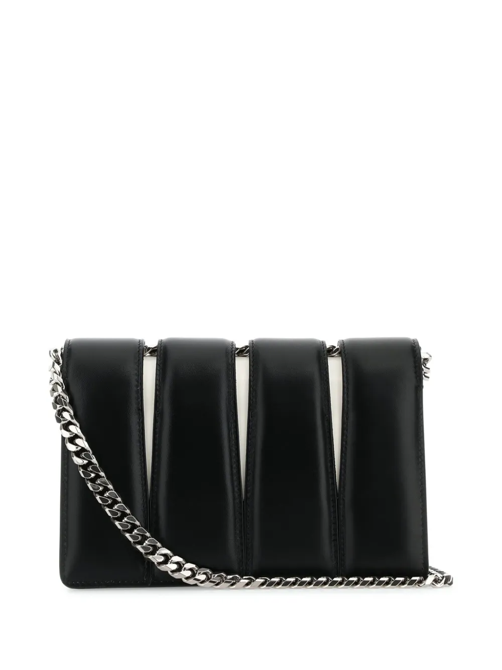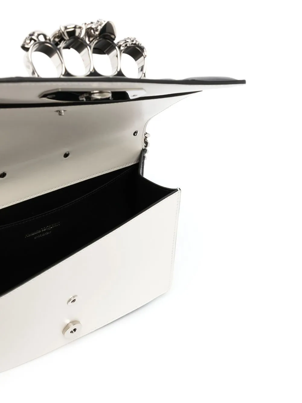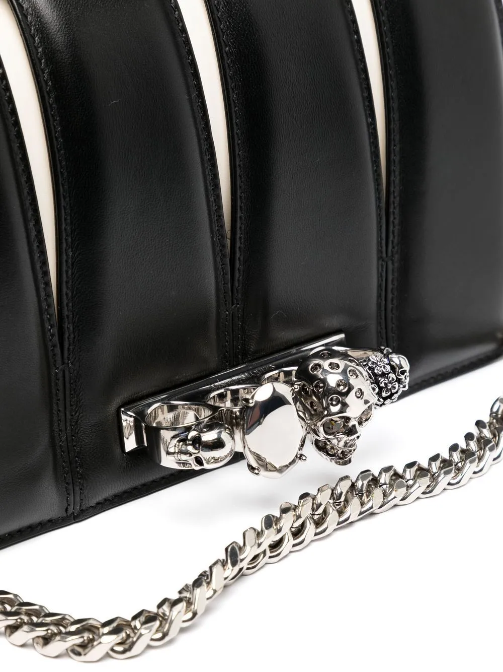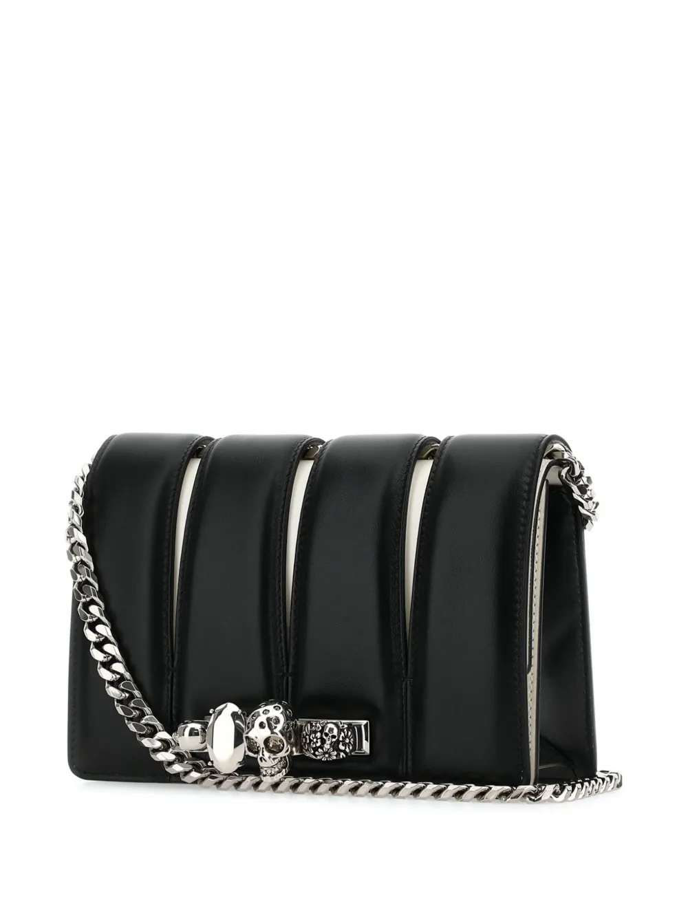 Черный/белый, телячья кожа, вырезные детали, деталь в форме черепа, заклепки, серебристая фурнитура, ремешок-цепочка на плечо и основное отделение.