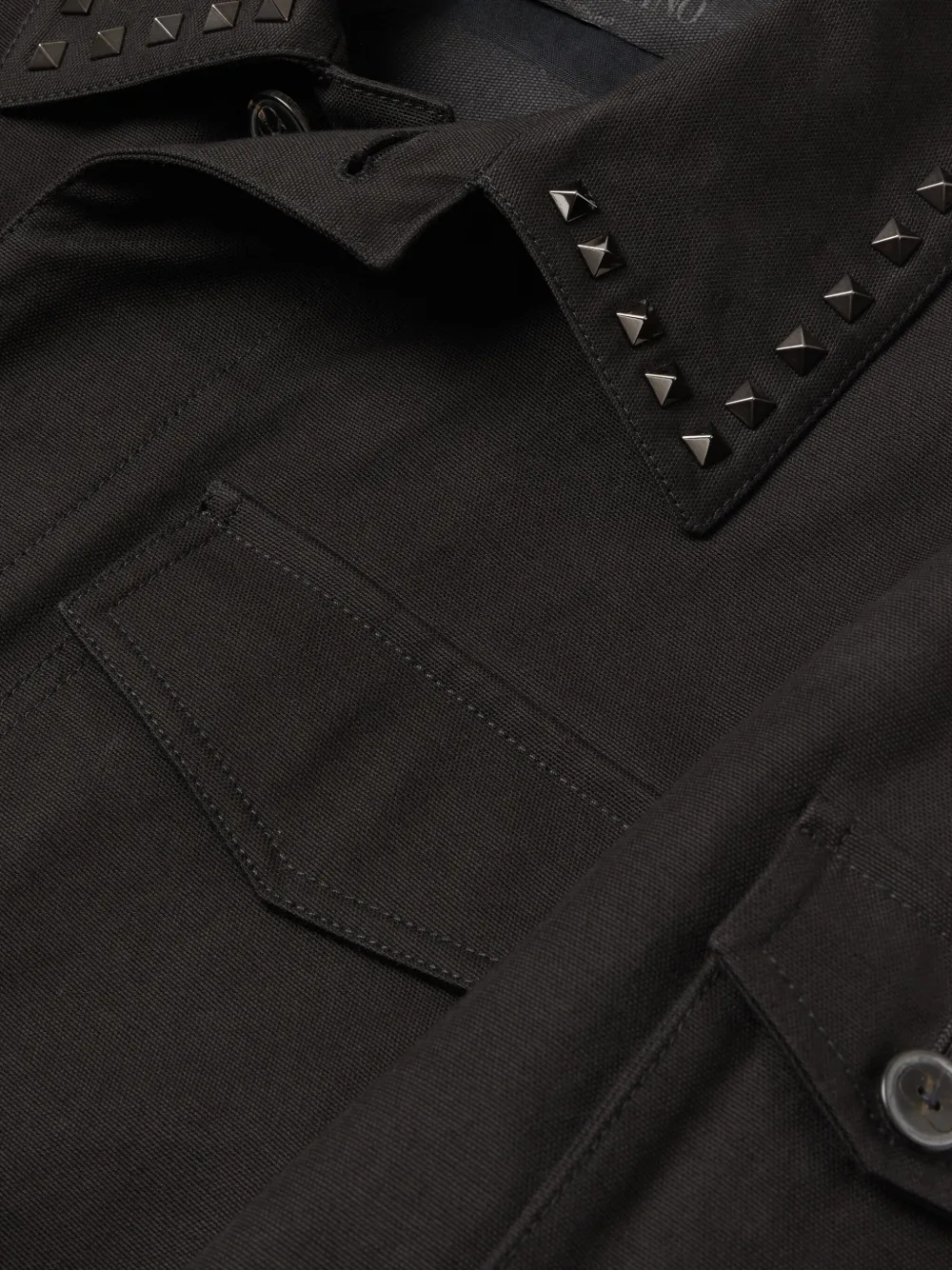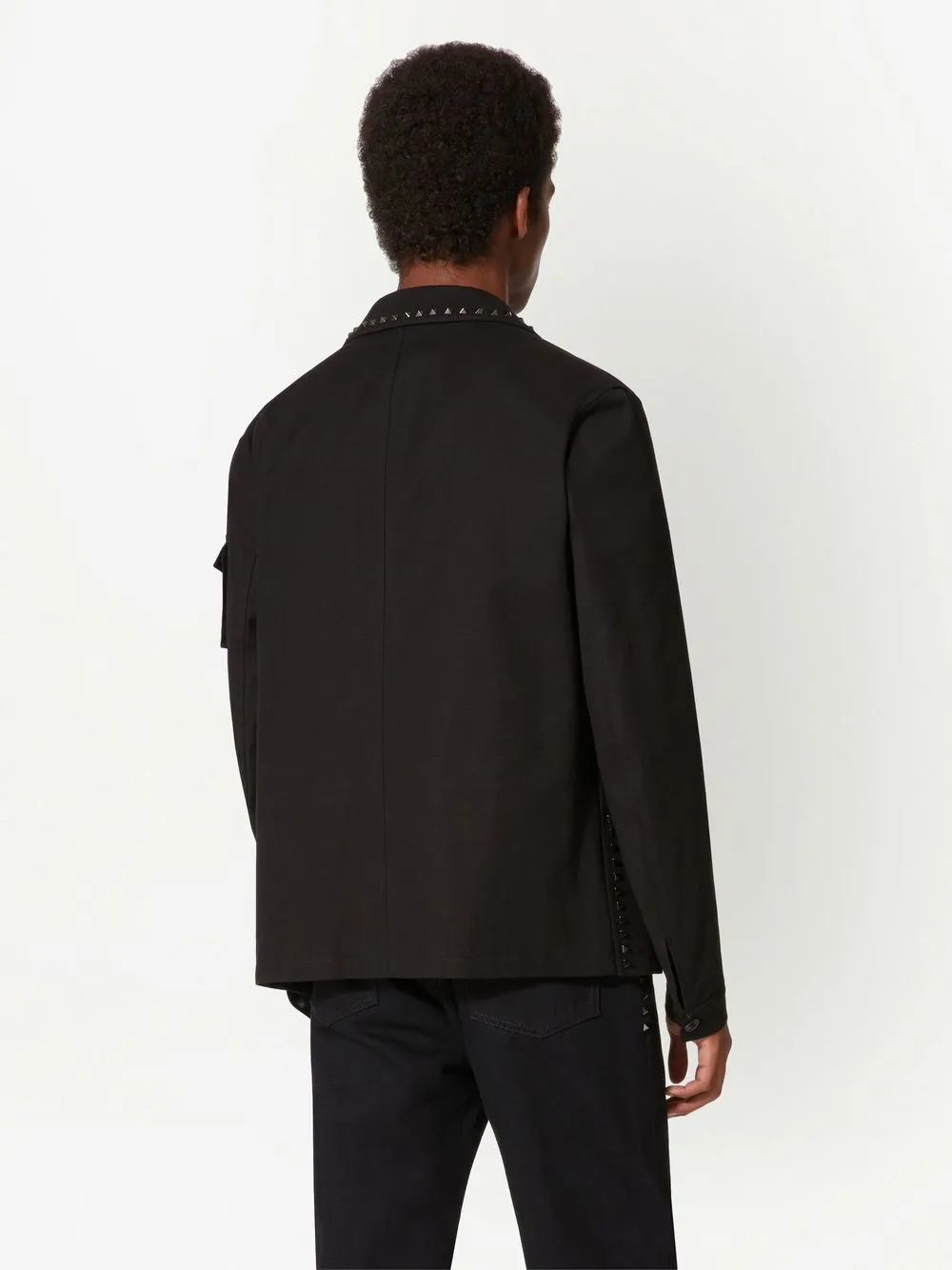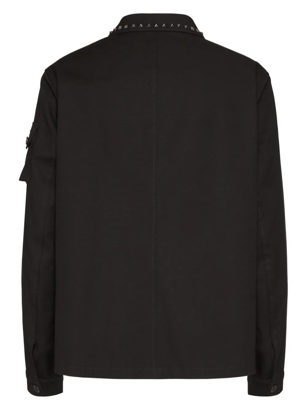 Коллекция Valentino Ready To Wear, черный, эластичный хлопок, смесь хлопка и льна, заклепки, прямой воротник, застежка на пуговицах спереди, длинные рукава, манжеты на пуговицах, два нагрудных кармана с клапанами и прямой подол. Образ включает аксессуары Valentino Garavani.