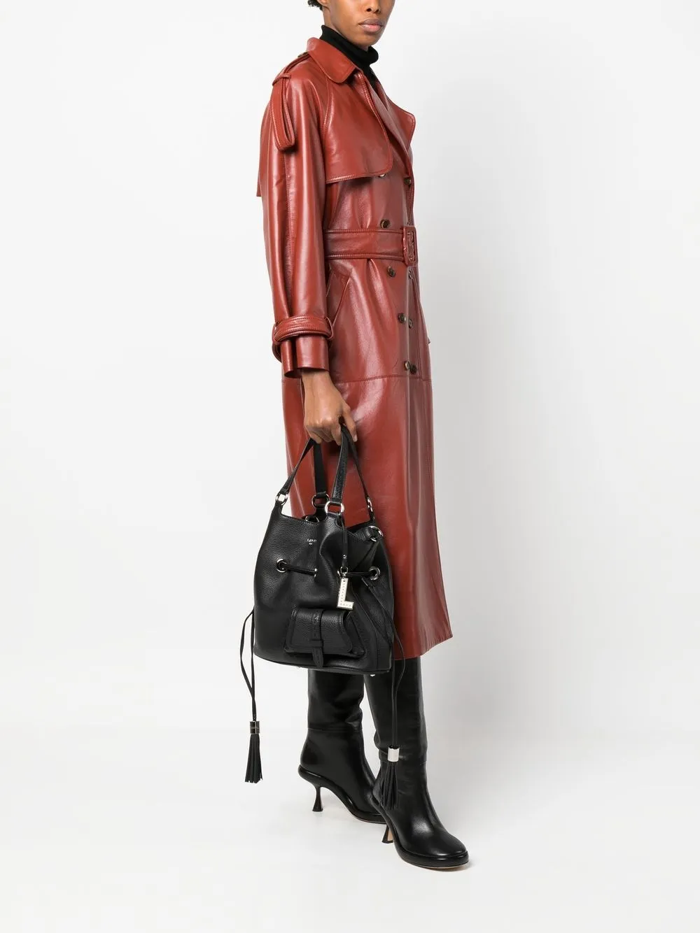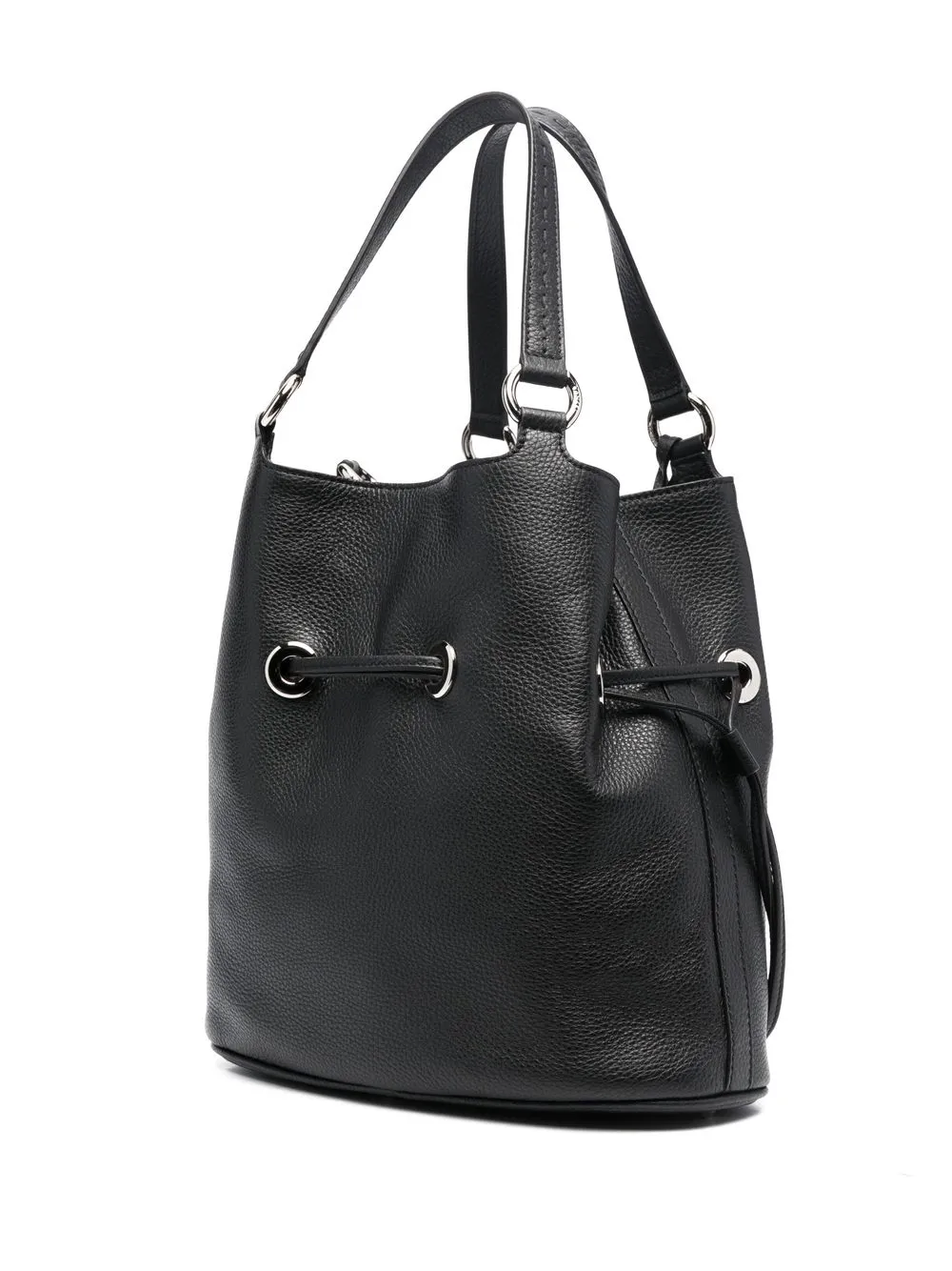 Черный, телячья кожа, подвеска с логотипом, тисненый логотип спереди, декоративные кисточки, две верхние ручки, съемный регулируемый ремень на плечо, кулиска, основное отделение, внутренний карман на молнии, нашивка с логотипом внутри, передний карман с клапаном, металлические ножки и серебристая фурнитура.