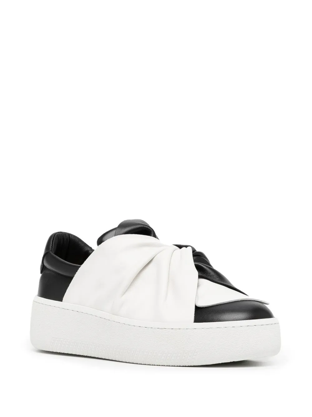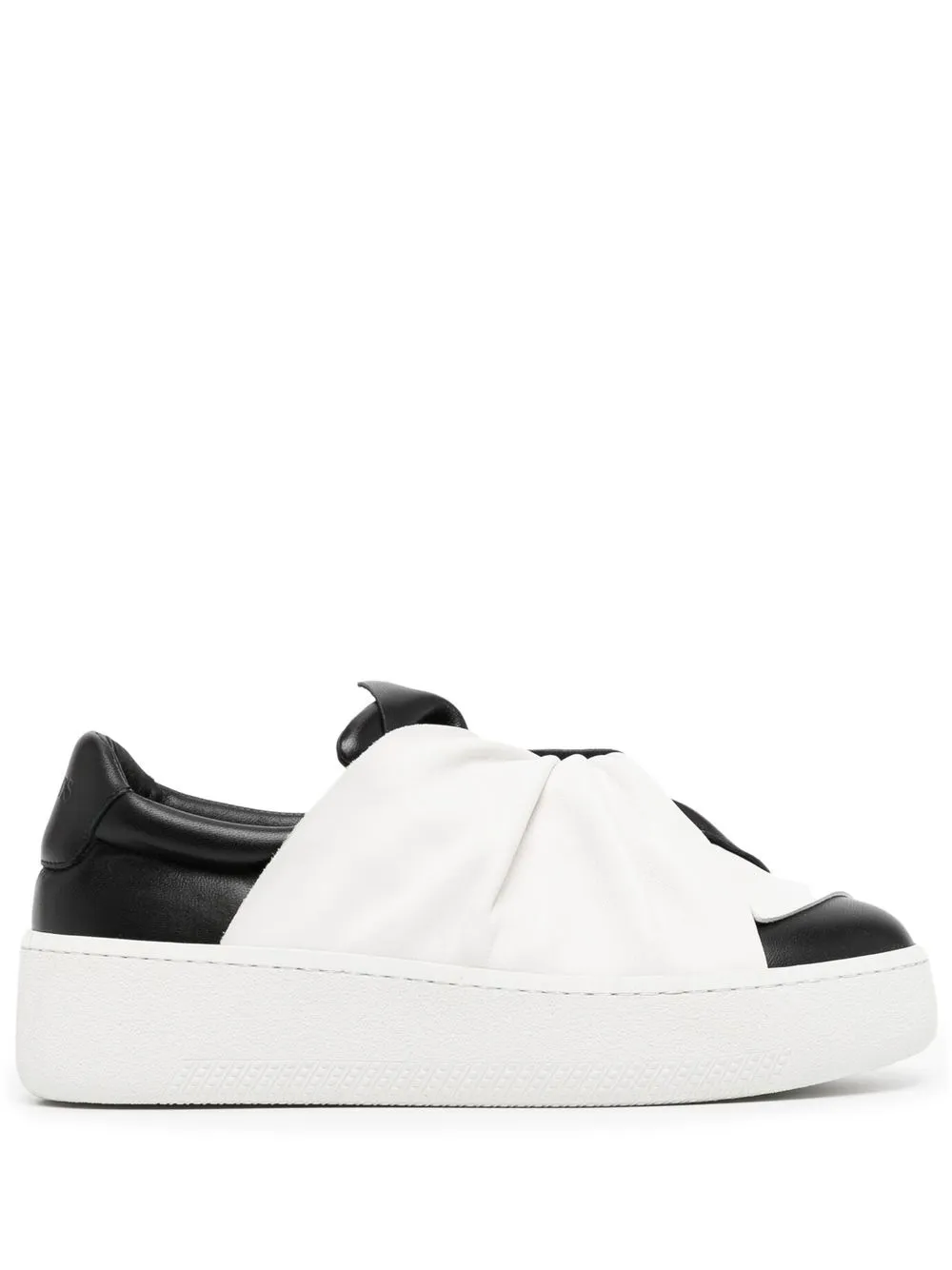 Черный/белый, телячья кожа, дизайн колор-блок, декор в виде узла, тисненый логотип сзади, закругленный носок, кожаная стелька с логотипом и подошва на платформе.