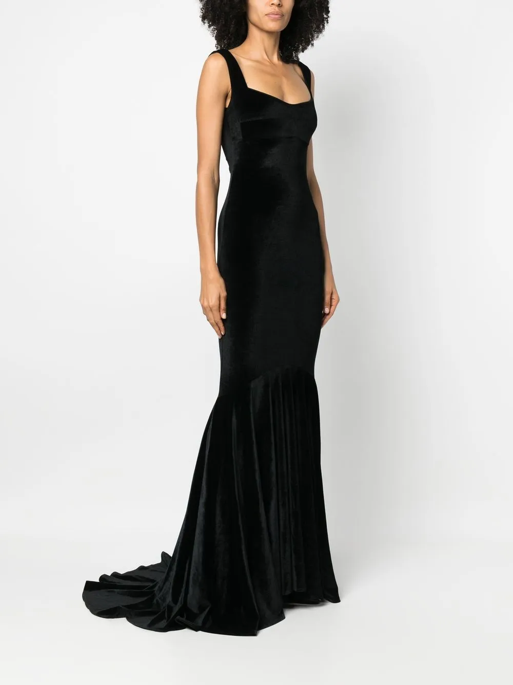 Черный бархат квадратный вырез U-образный вырез на спине узкие бретели застежка на молнии сзади шлейф от уровня колен длинная модель