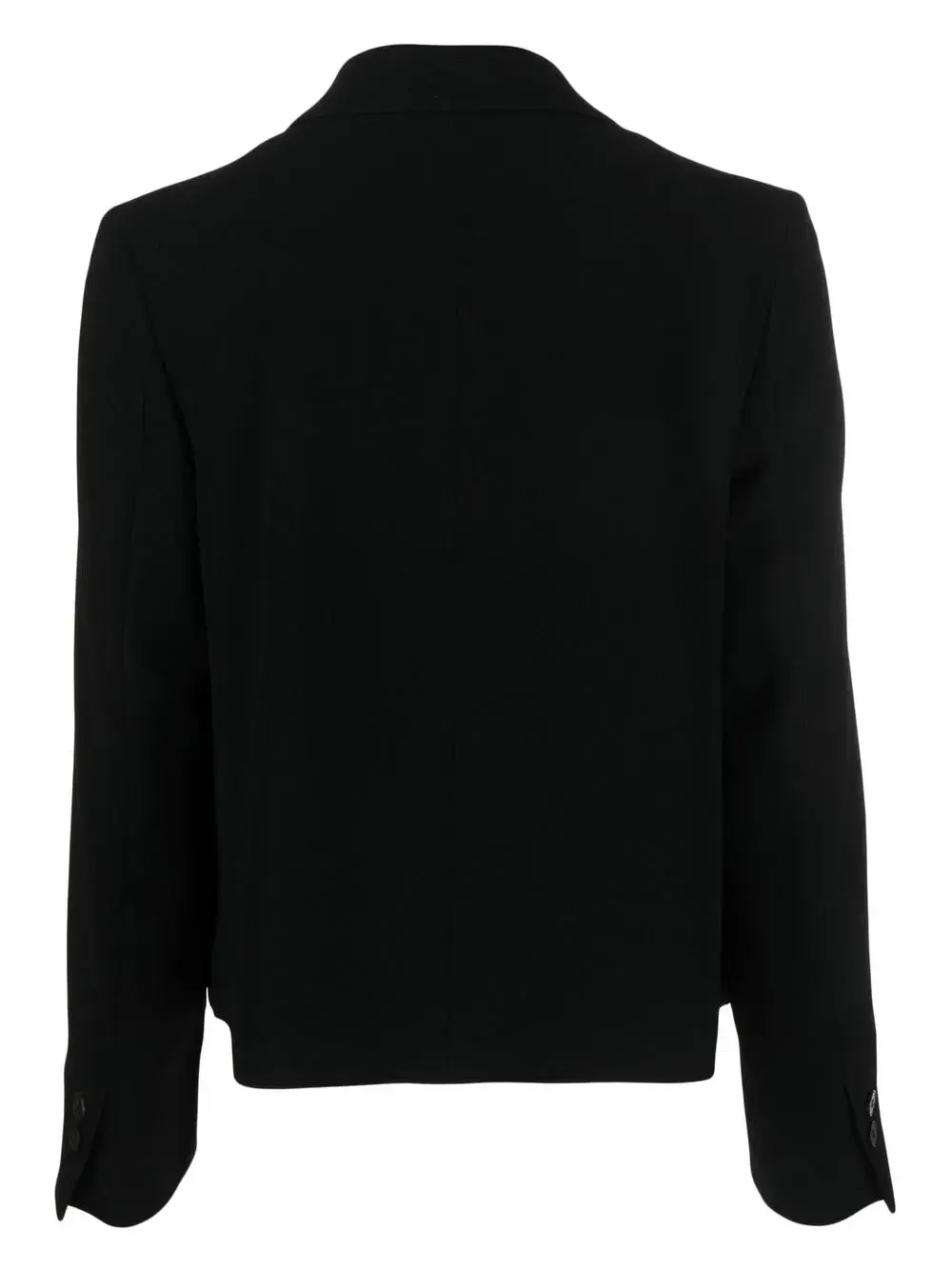 Черный, ткань джерси, зазубренные лацканы, прорезной карман на груди, два кармана с клапанами по бокам, рукава с манжетами на пуговицах и цельная подкладка.
