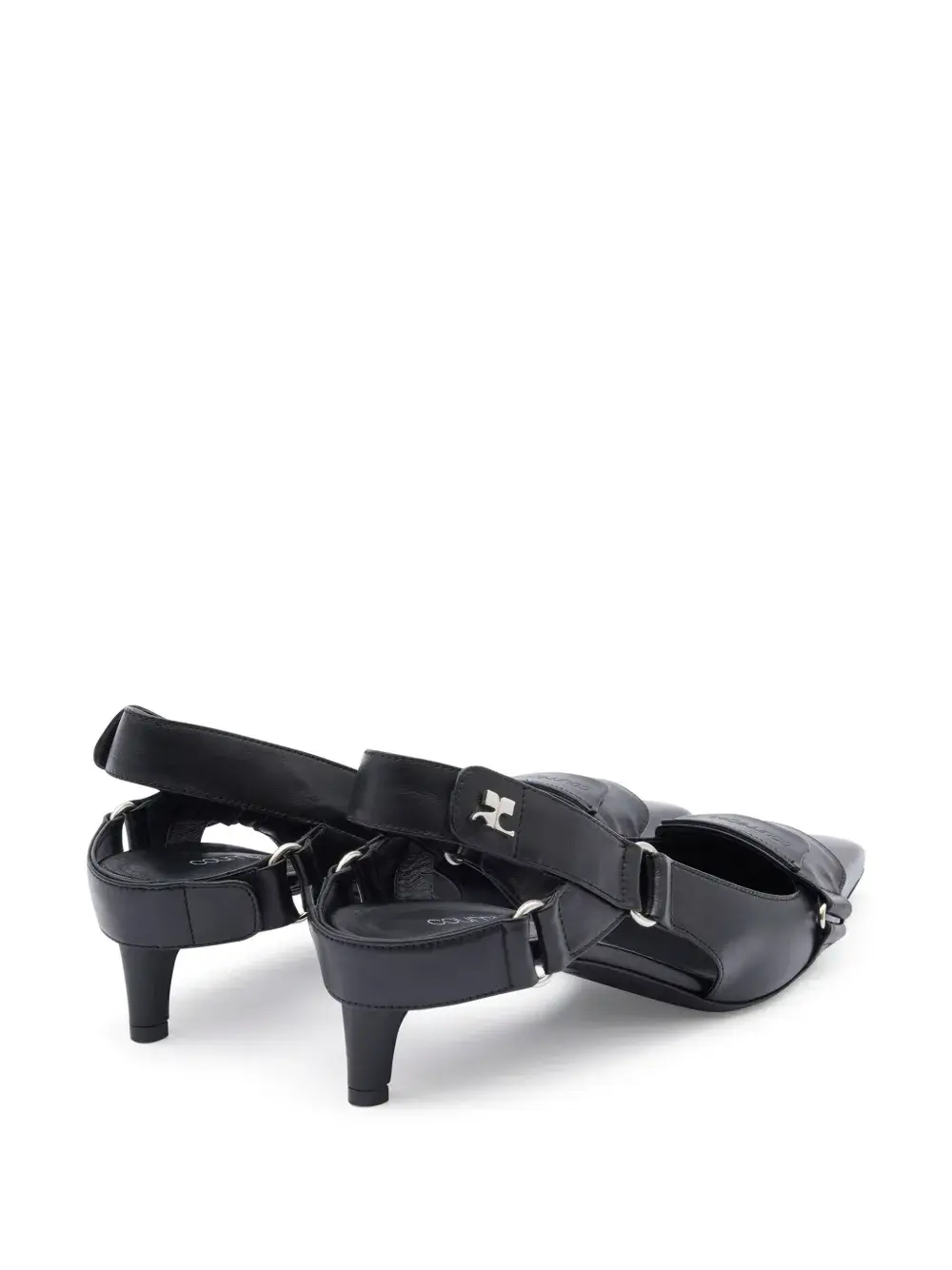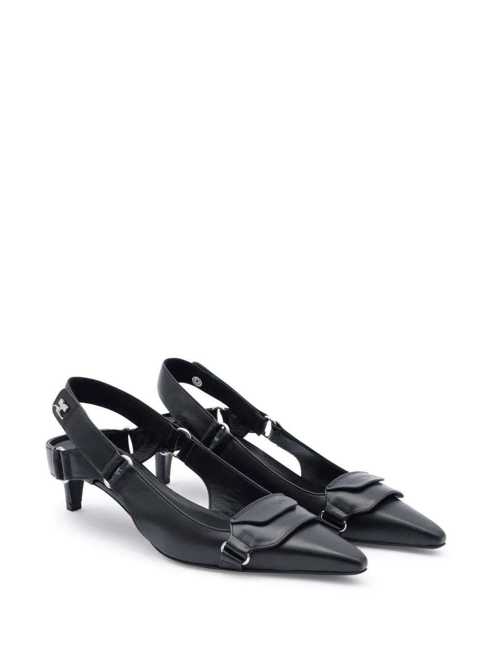 Черный, овечья кожа, серебристый металлический логотип, тисненый логотип спереди, серебристая фурнитура, стелька с логотипом, заостренный носок, ремешок на пятке, застежка на кнопках и низкий каблук.