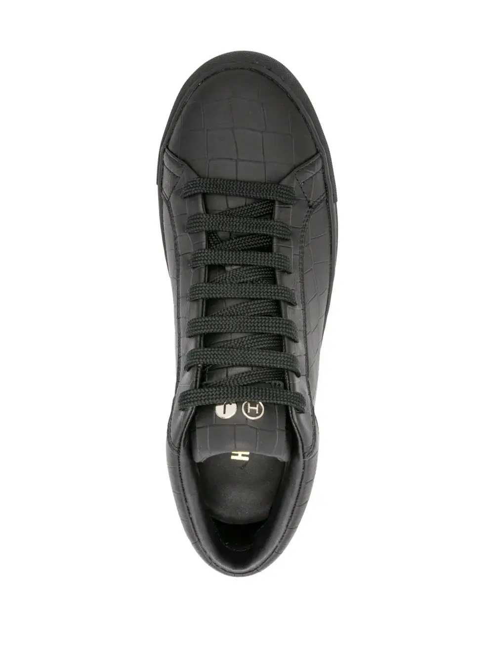 Черный, телячья кожа, тиснение под кожу крокодила, металлический логотип на язычке, закругленный носок, шнуровка спереди, резиновая подошва и логотип на подошве.