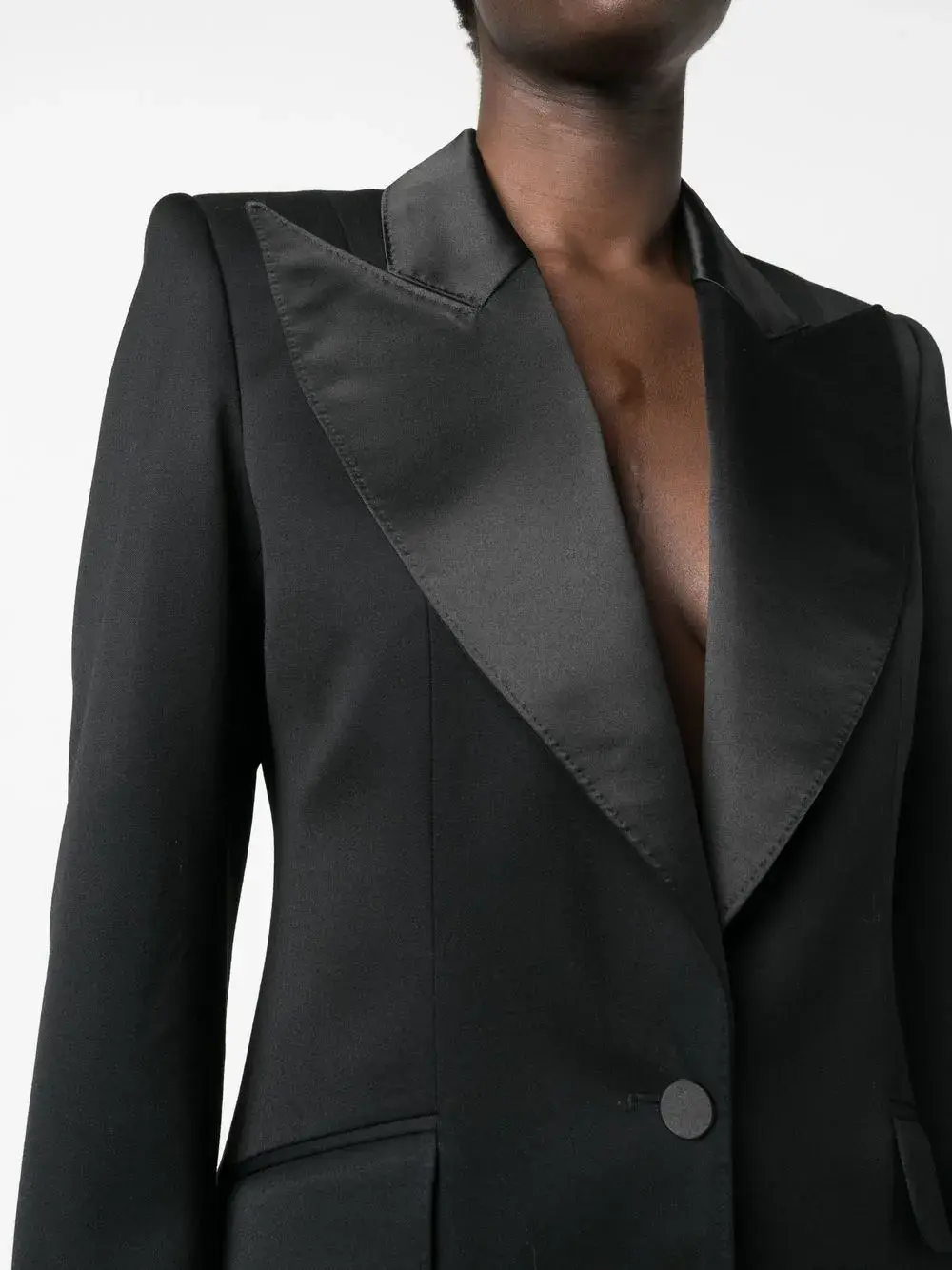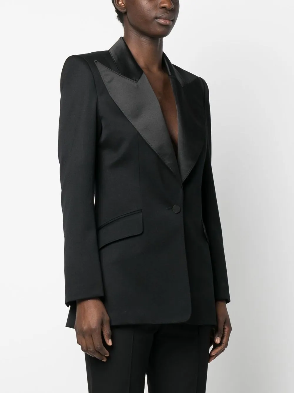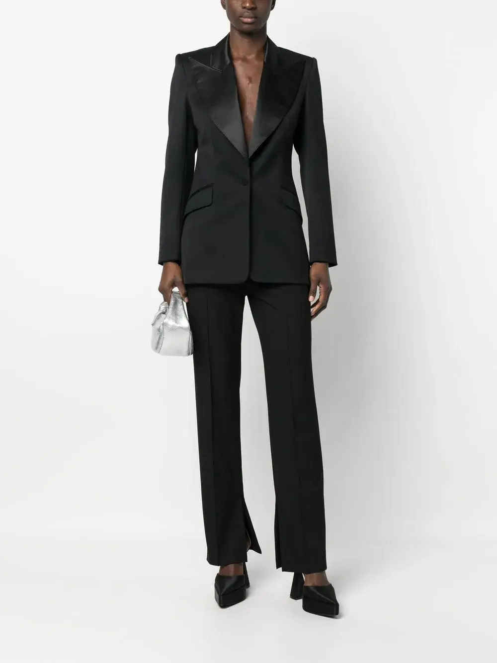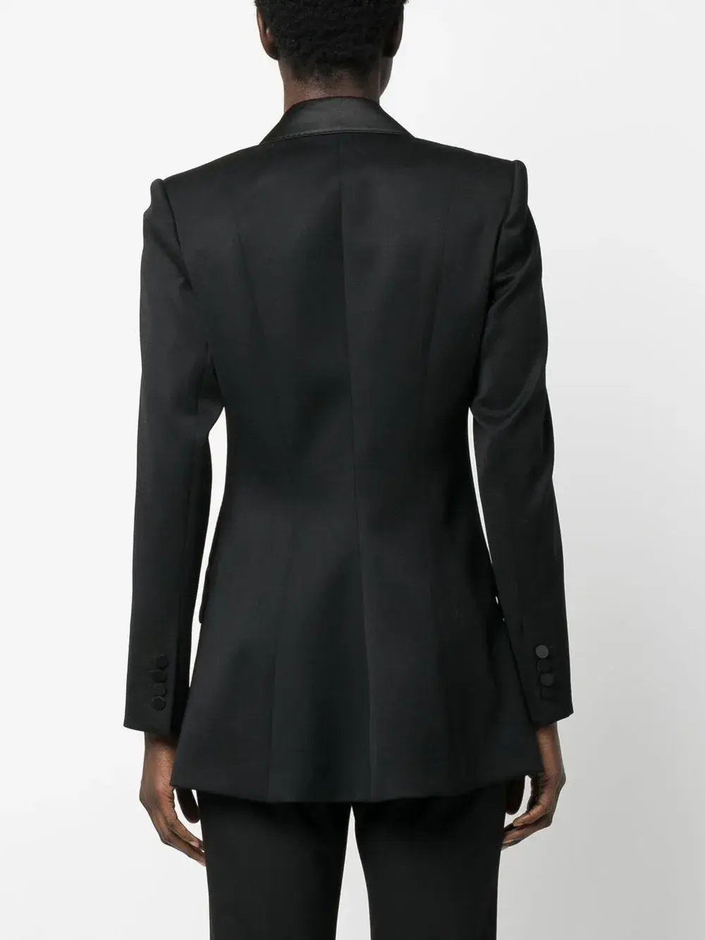 Черный, смесовая шерсть, широкие заостренные лацканы, застежка на пуговицах спереди, длинные рукава, манжеты на пуговицах, прямой подол, скругленные углы и два передних кармана с клапанами.