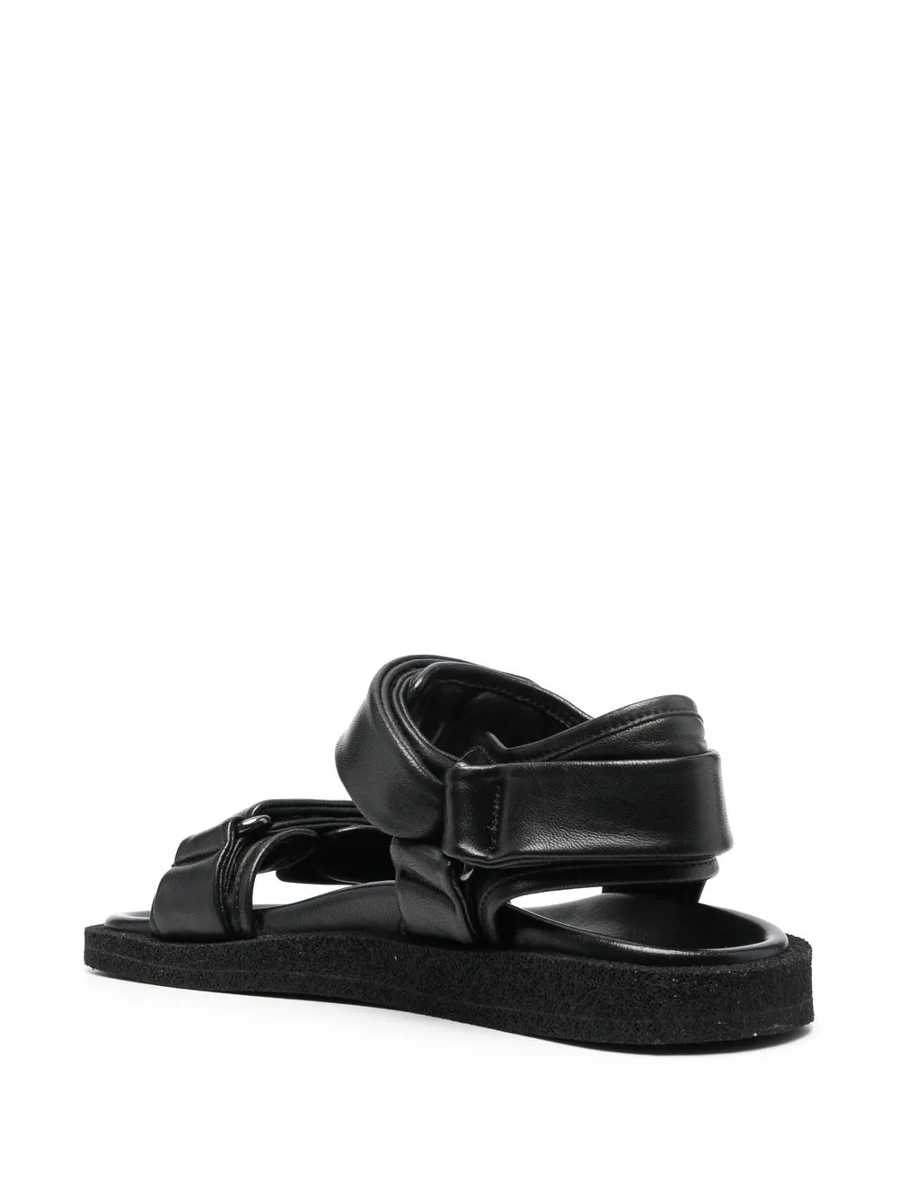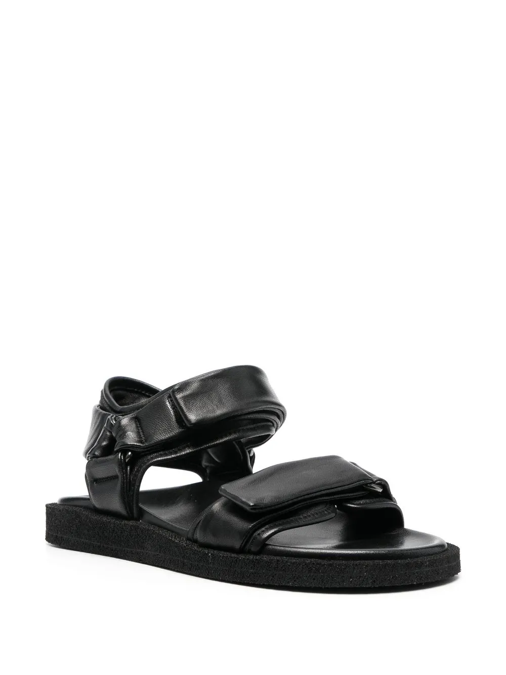 Черный, телячья кожа, открытый носок, застежка на липучке спереди, ремешки, ремешок на пятке, кожаная стелька с логотипом и плоская резиновая подошва.