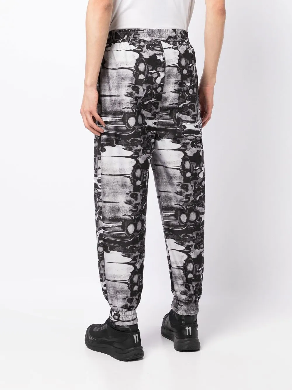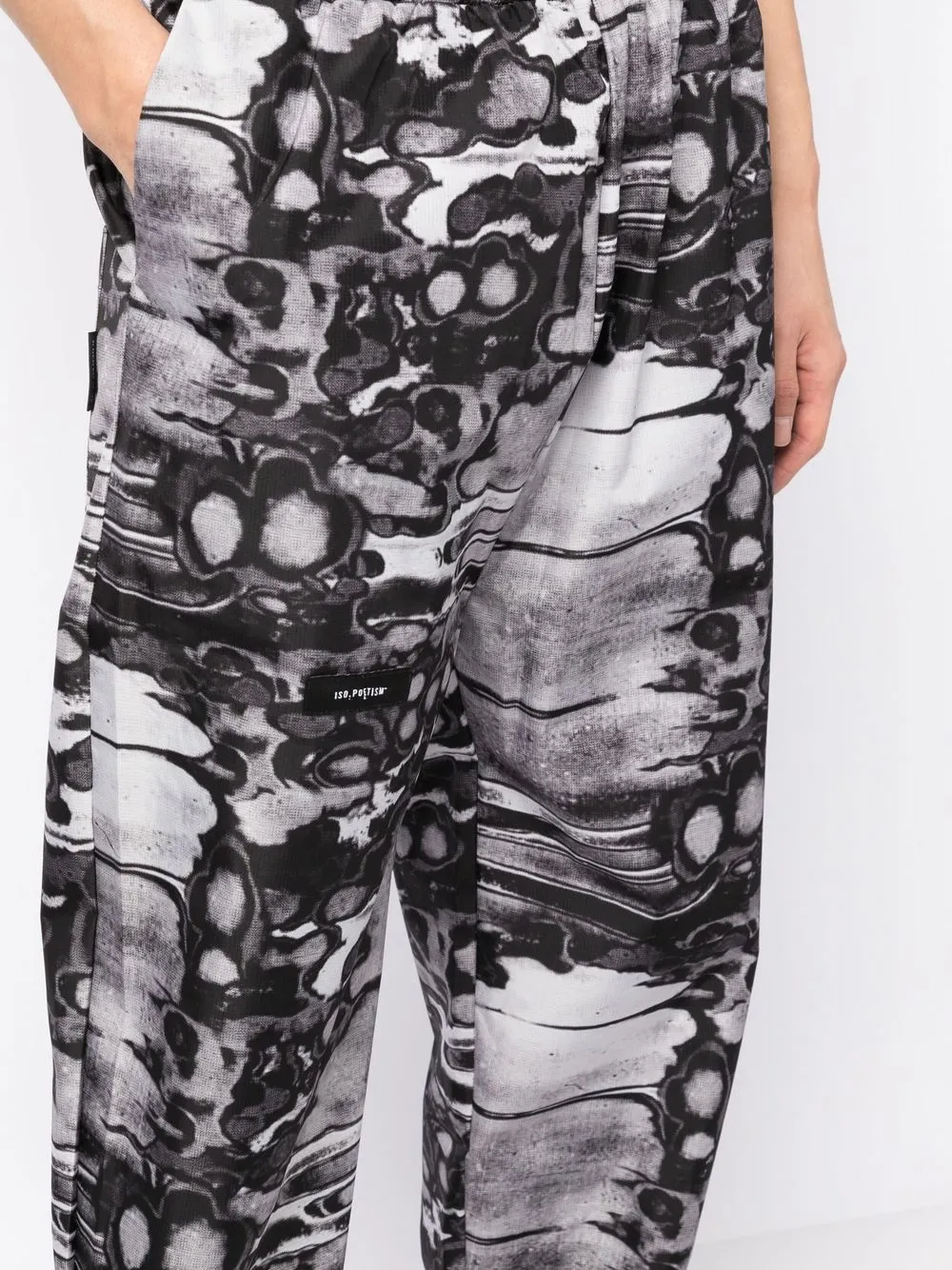 Черный/серый, абстрактный принт, эластичный пояс, эластичные манжеты, два прорезных кармана по бокам и накладной карман сзади.